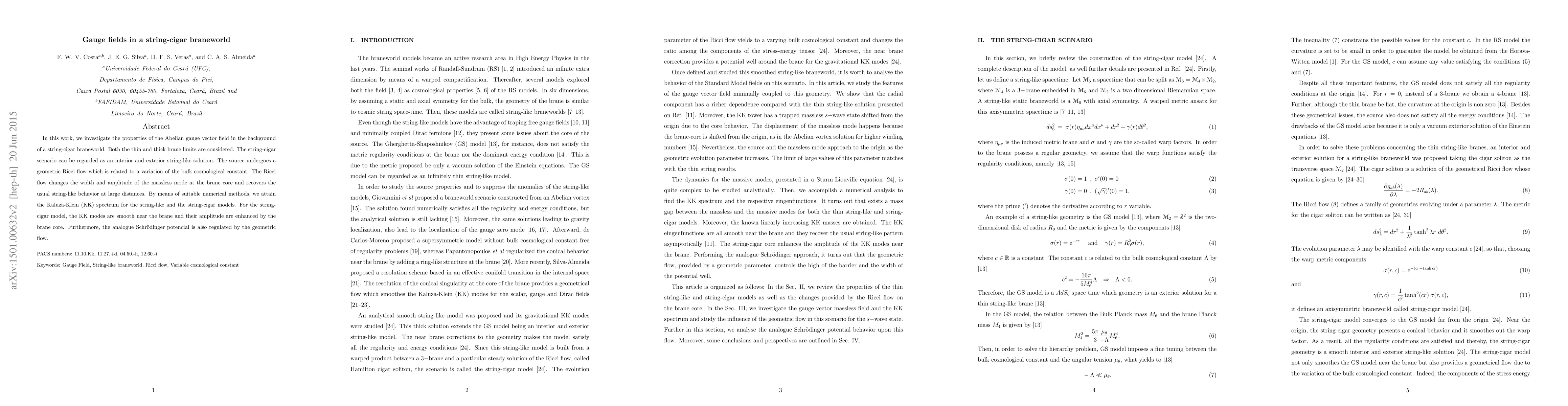 In this work we investigate the properties of an Abelian gauge vector field in a thin and in a smoothed string-like braneworld, the so-called string-cigar model. This thick brane scenario satisfies the regularity conditions and it can be regarded as an interior and exterior string-like solution. The source undergoes a geometric Ricci flow which is connected to a variation of the bulk cosmological constant. The Ricci flow changes the width and amplitude of the massless mode at the brane core and recover the usual thin string-like behavior at large distances. By numerical means we obtain the Kaluza-Klein (KK) spectrum for both the thin brane and the string-cigar. It turns out that both models exhibit a mass gap between the massless and the massive modes and between the high and the low mass regimes. The KK modes are smooth near the brane and their amplitude are enhanced by the string-cigar core. The analogue Schr\"odinger potential is also tuned by the geometric flow.