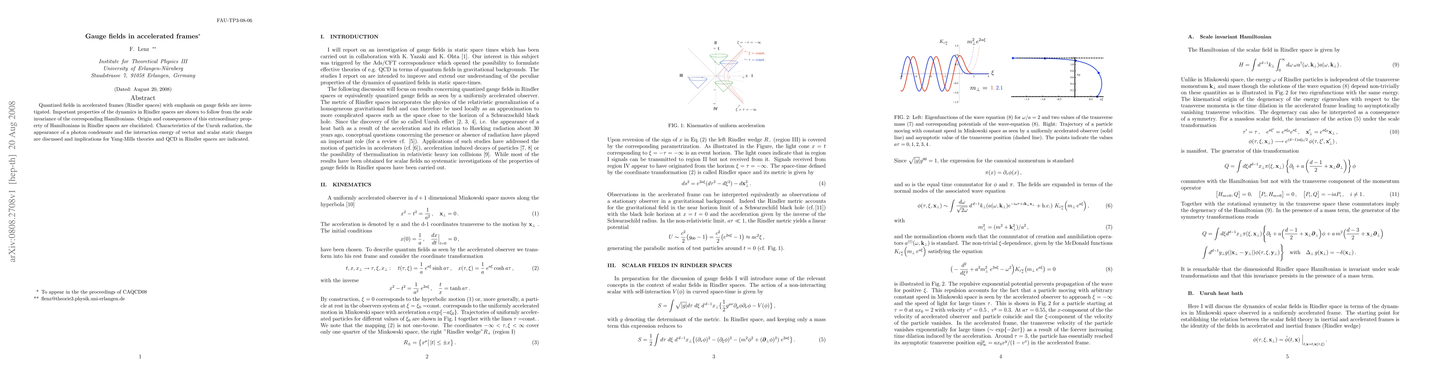 Quantized fields in accelerated frames (Rindler spaces) with emphasis on gauge fields are investigated. Important properties of the dynamics in Rindler spaces are shown to follow from the scale invariance of the corresponding Hamiltonians. Origin and consequences of this extraordinary property of Hamiltonians in Rindler spaces are elucidated. Characteristics of the Unruh radiation, the appearance of a photon condensate and the interaction energy of vector and scalar static charges are discussed and implications for Yang-Mills theories and QCD in Rindler spaces are indicated.