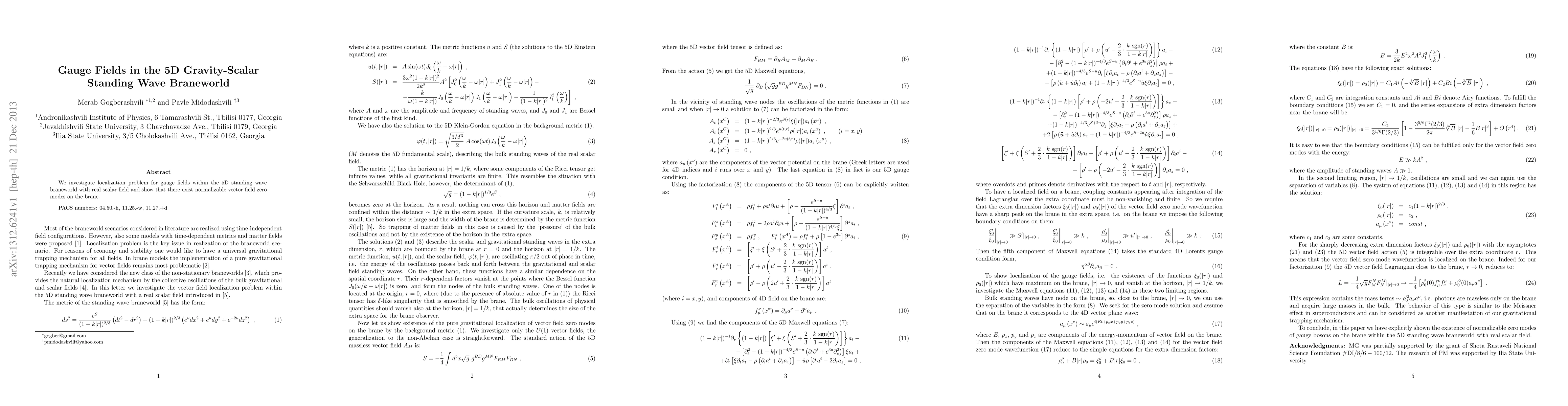 Summary: This paper explores the localization of gauge fields in a 5D standing wave braneworld model incorporating a real scalar field, revealing the existence of normalizable vector field zero modes on the brane.