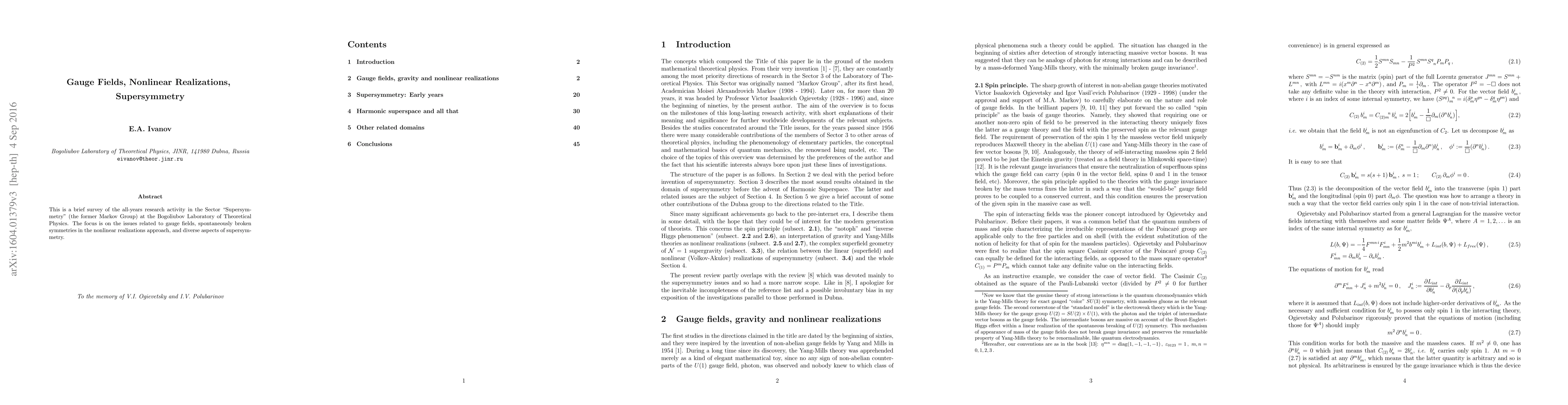 This is a brief survey of the all-years research activity in the Sector "Supersymmetry" (the former Markov Group) at the Bogoliubov Laboratory of Theoretical Physics. The focus is on the issues related to gauge fields, spontaneously broken symmetries in the nonlinear realizations approach, and diverse aspects of supersymmetry.