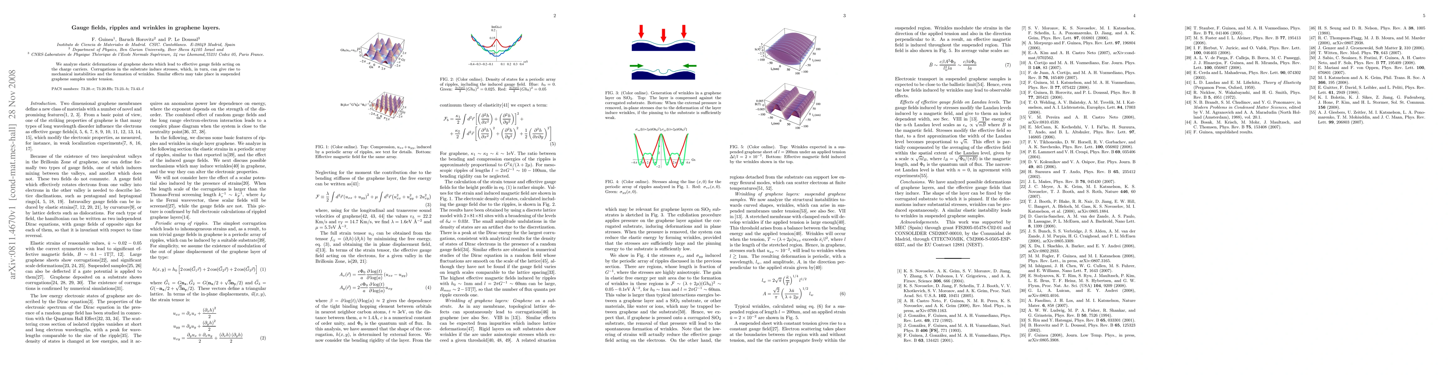 This paper investigates how elastic deformations in graphene sheets generate effective gauge fields influencing charge carriers, while substrate corrugations cause stresses that can lead to mechanical instabilities and wrinkle formation, particularly in suspended, tensioned graphene samples.