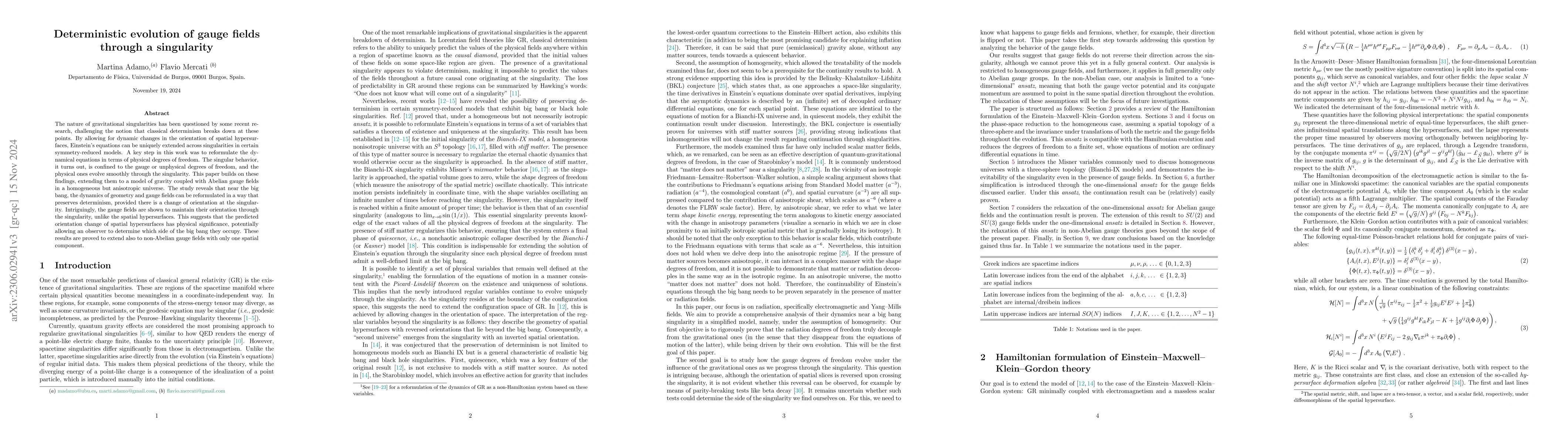 This paper explores the preservation of classical determinism in gravitational singularities by extending Einstein's equations through dynamically changing spatial hypersurface orientations. It demonstrates that gauge fields maintain their orientation across the Big Bang singularity, suggesting an observer can identify the side of the Big Bang they are on.