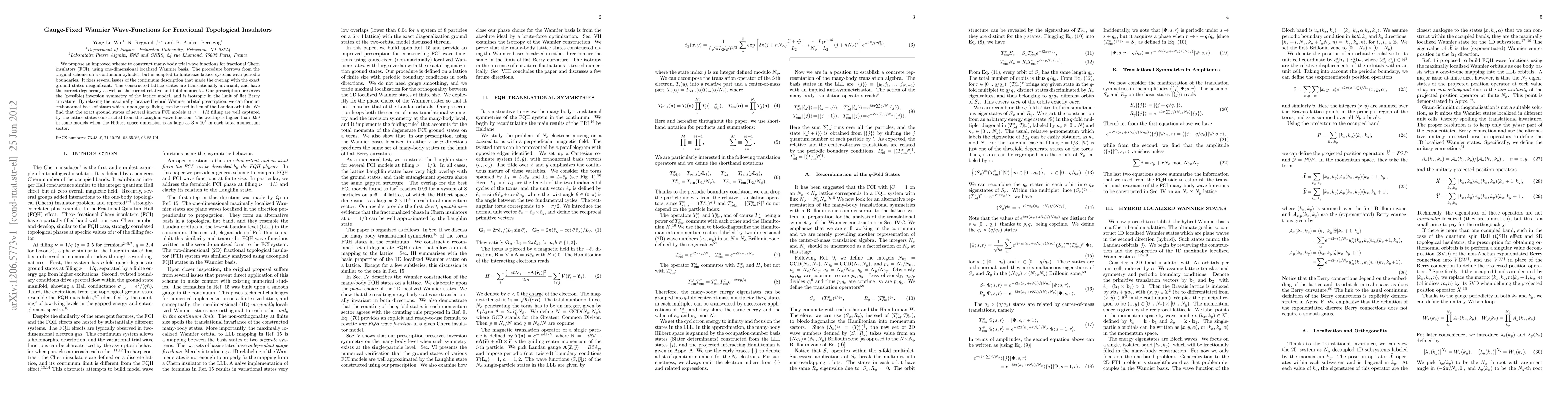 Researchers propose an improved method to create trial wave functions for fractional topological insulators using localized Wannier basis, showing high accuracy in capturing exact ground states with an overlap of 0.99 in some cases.