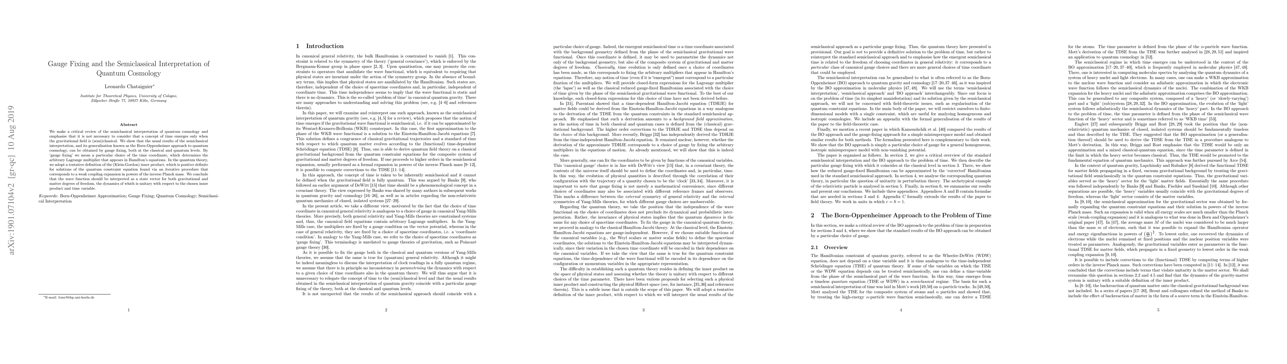 This paper critiques the semiclassical interpretation of quantum cosmology, arguing that time does not necessitate a classical gravitational field. It demonstrates that gauge fixing, specifically a chosen time coordinate, can yield the same results as the semiclassical approach, maintaining a unitary dynamics for gravitational and matter degrees of freedom.