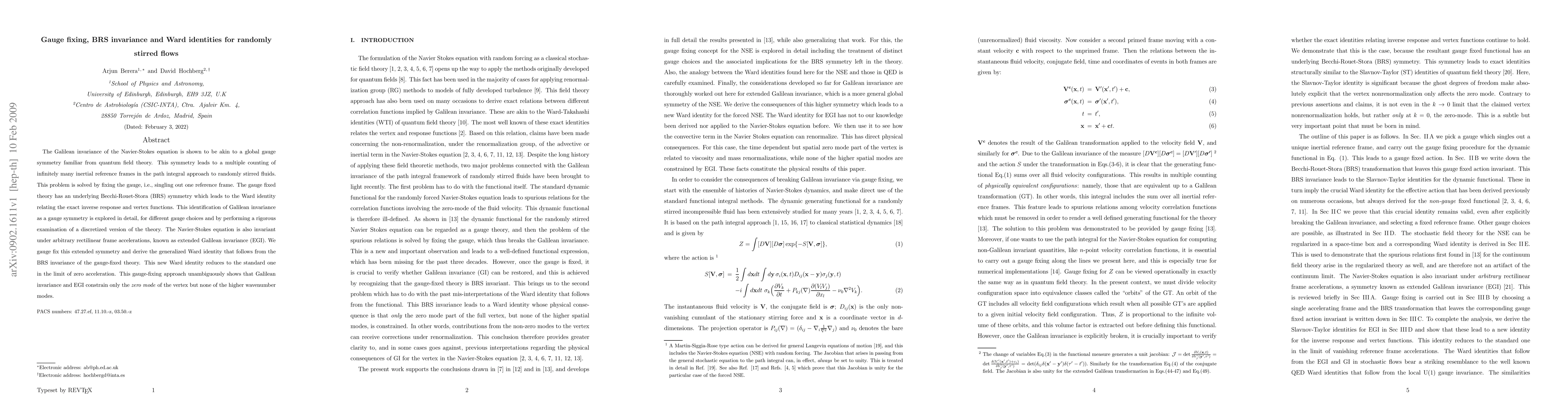 The Galilean invariance of the Navier-Stokes equation is shown to be akin to a global gauge symmetry familiar from quantum field theory. This symmetry leads to a multiple counting of infinitely many inertial reference frames in the path integral approach to randomly stirred fluids. This problem is solved by fixing the gauge, i.e., singling out one reference frame. The gauge fixed theory has an underlying Becchi-Rouet-Stora (BRS) symmetry which leads to the Ward identity relating the exact inverse response and vertex functions. This identification of Galilean invariance as a gauge symmetry is explored in detail, for different gauge choices and by performing a rigorous examination of a discretized version of the theory. The Navier-Stokes equation is also invariant under arbitrary rectilinear frame accelerations, known as extended Galilean invariance (EGI). We gauge fix this extended symmetry and derive the generalized Ward identity that follows from the BRS invariance of the gauge-fixed theory. This new Ward identity reduces to the standard one in the limit of zero acceleration. This gauge-fixing approach unambiguously shows that Galilean invariance and EGI constrain only the zero mode of the vertex but none of the higher wavenumber modes.