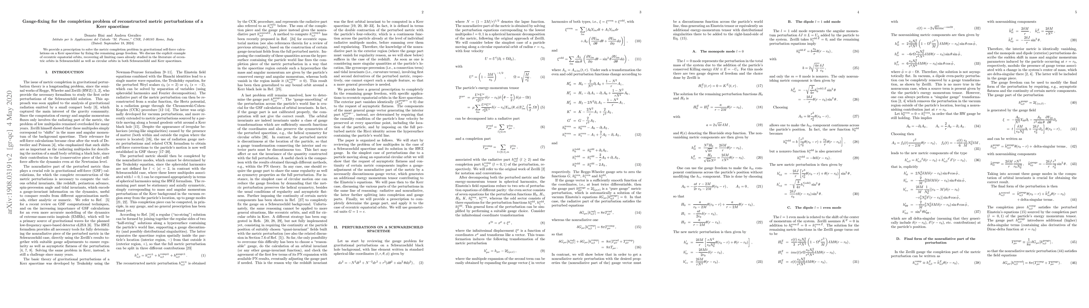 We provide a prescription to solve the metric completion problem in gravitational self-force calculations on a Kerr spacetime by fixing the remaining gauge freedom. We discuss the explicit example of eccentric equatorial orbits, recovering all limiting cases already studied in the literature of eccentric orbits in Schwarzschild as well as circular orbits in both Schwarzschild and Kerr spacetimes.