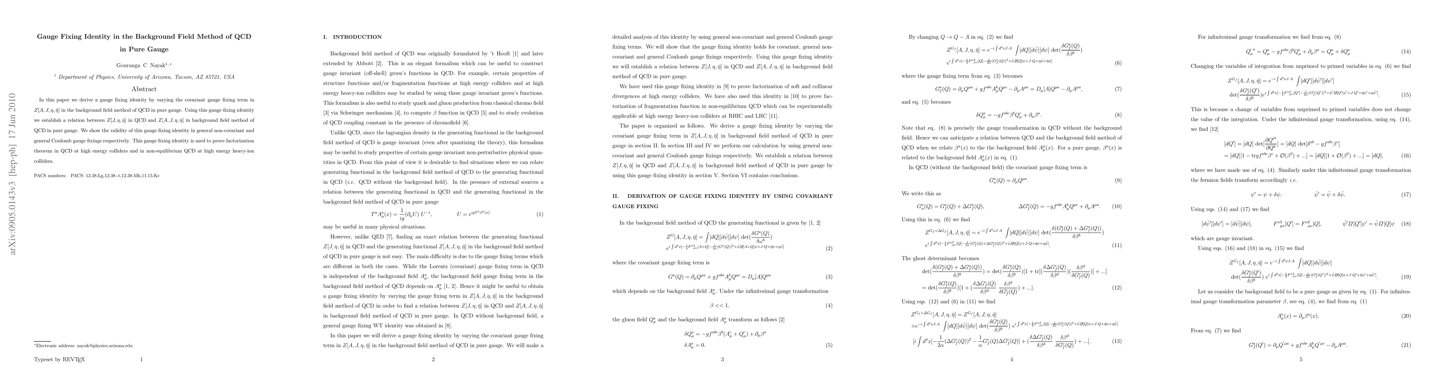 In this paper we derive a gauge fixing identity by varying the covariant gauge fixing term in $Z[A,J,\eta, {\bar \eta}]$ in the background field method of QCD in pure gauge. Using this gauge fixing identity we establish a relation between $Z[J,\eta,{\bar \eta}]$ in QCD and $Z[A,J,\eta, {\bar \eta}]$ in background field method of QCD in pure gauge. We show the validity of this gauge fixing identity in general non-covariant and general Coulomb gauge fixings respectively. This gauge fixing identity is used to prove factorization theorem in QCD at high energy colliders and in non-equilibrium QCD at high energy heavy-ion colliders.