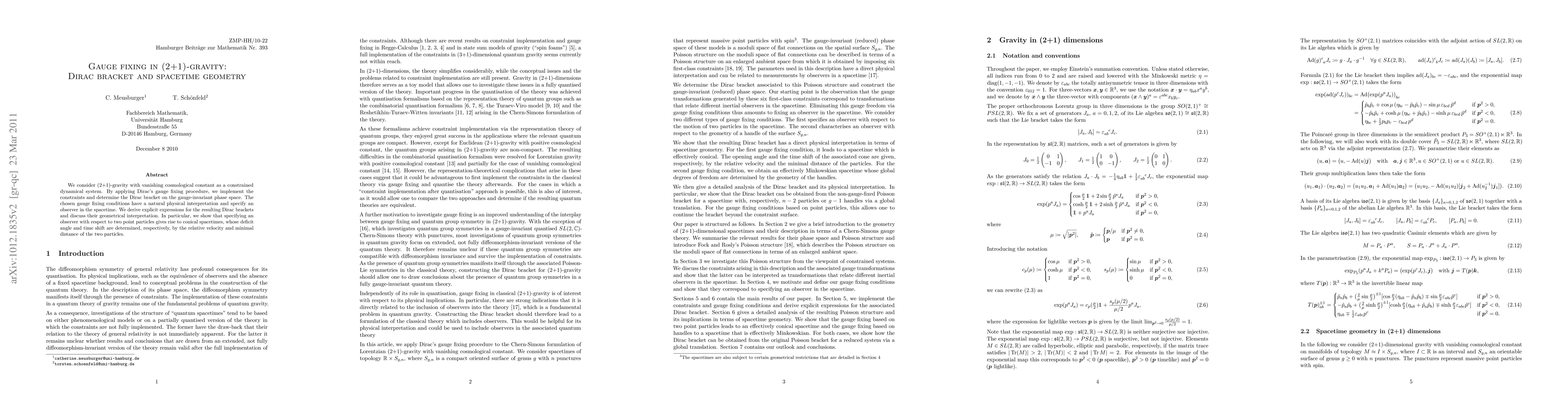 The novelty lies in the detailed application of Dirac's procedure to (2+1)-gravity, the explicit determination of conical spacetimes through gauge-fixing, and the physical interpretation of the observer specification in terms of spacetime geometry.