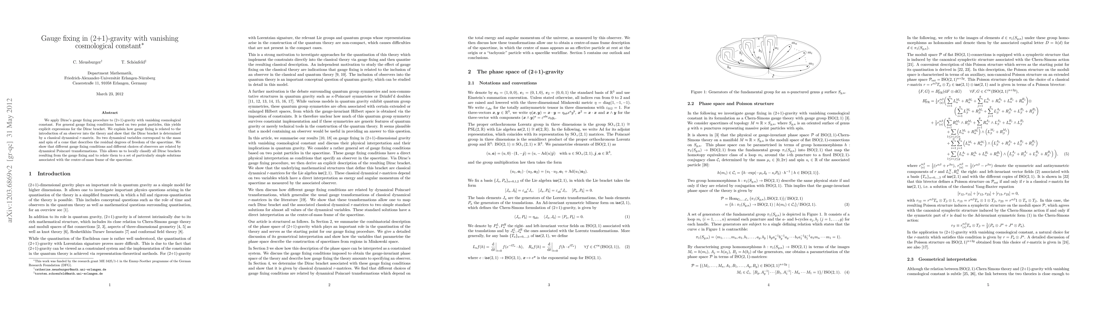 We apply Dirac's gauge fixing procedure to (2+1)-gravity with vanishing cosmological constant. For general gauge fixing conditions based on two point particles, this yields explicit expressions for the Dirac bracket. We explain how gauge fixing is related to the introduction of an observer into the theory and show that the Dirac bracket is determined by a classical dynamical r-matrix. Its two dynamical variables correspond to the mass and spin of a cone that describes the residual degrees of freedom of the spacetime. We show that different gauge fixing conditions and different choices of observers are related by dynamical Poincar\'e transformations. This allows us to locally classify all Dirac brackets resulting from the gauge fixing and to relate them to a set of particularly simple solutions associated with the centre-of-mass frame of the spacetime.
