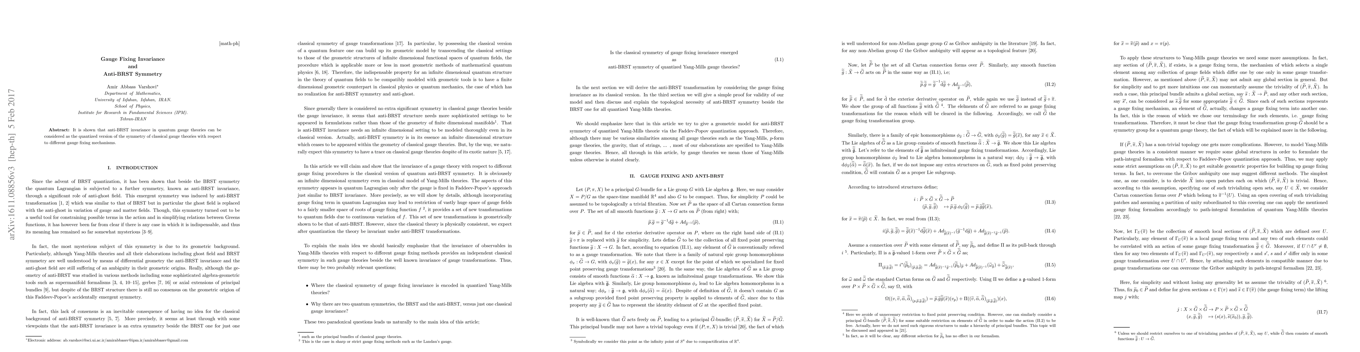 It is shown that anti-BRST invariance in quantum gauge theories can be considered as the quantized version of the symmetry of classical gauge theories with respect to different gauge fixing mechanisms.