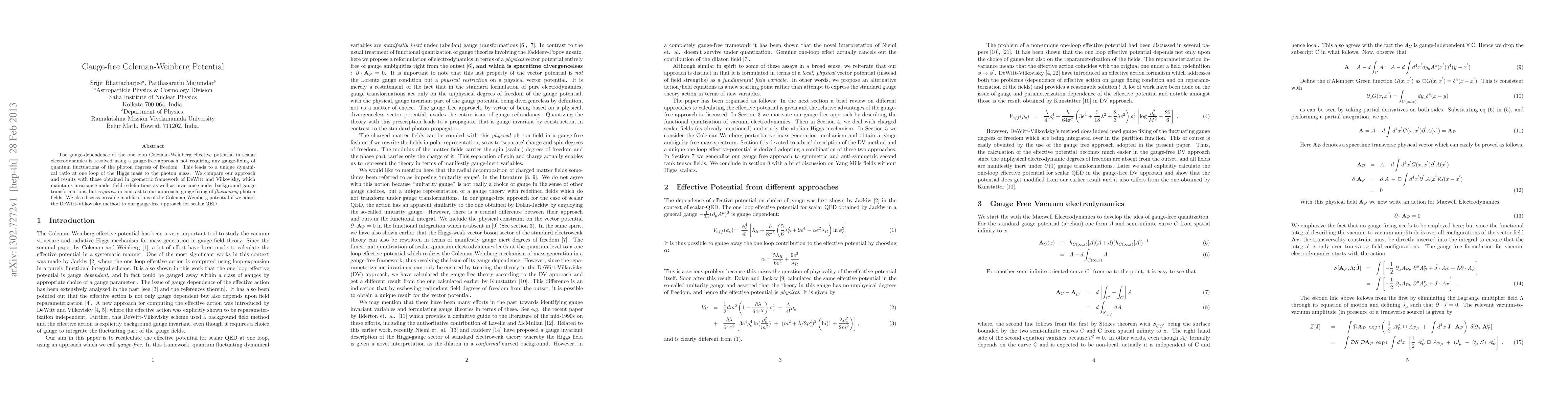 This paper resolves the gauge-dependence of the one-loop Coleman-Weinberg potential in scalar electrodynamics through a gauge-free method, yielding a unique Higgs-to-photon mass ratio. It contrasts this approach with the DeWitt-Vilkovisky geometric framework, which requires gauge fixing of fluctuating photon fields.