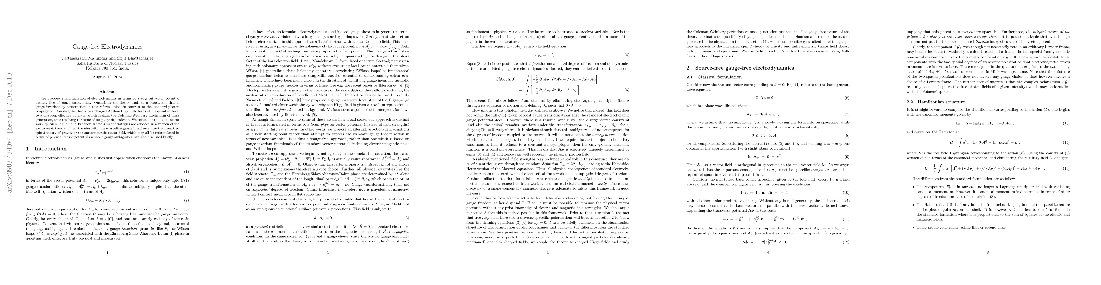 This paper reformulates electrodynamics using a gauge-free vector potential, resulting in a gauge invariant quantum propagator. It also demonstrates how this approach can generate mass via the Coleman-Weinberg mechanism, addressing gauge dependence issues, and relates these findings to similar strategies in electroweak theory and other gauge theories.