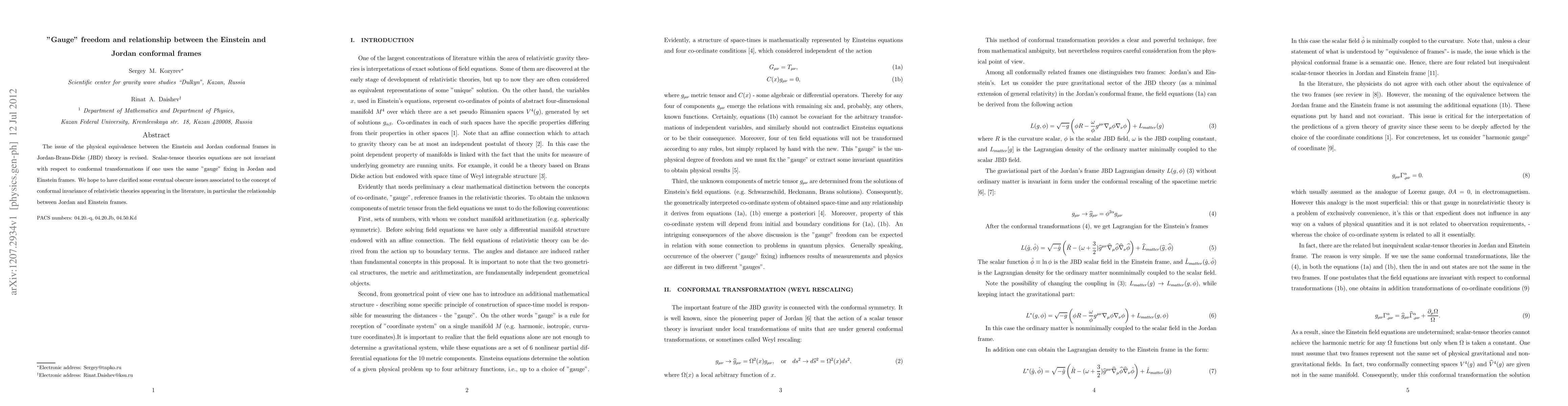 This paper examines the physical equivalence between the Einstein and Jordan conformal frames in Jordan-Brans-Dicke theory, highlighting that scalar-tensor theory equations are not invariant under conformal transformations when using the same gauge fixing in both frames. The study aims to clarify the relationship and conceptual issues surrounding conformal invariance in relativistic theories.