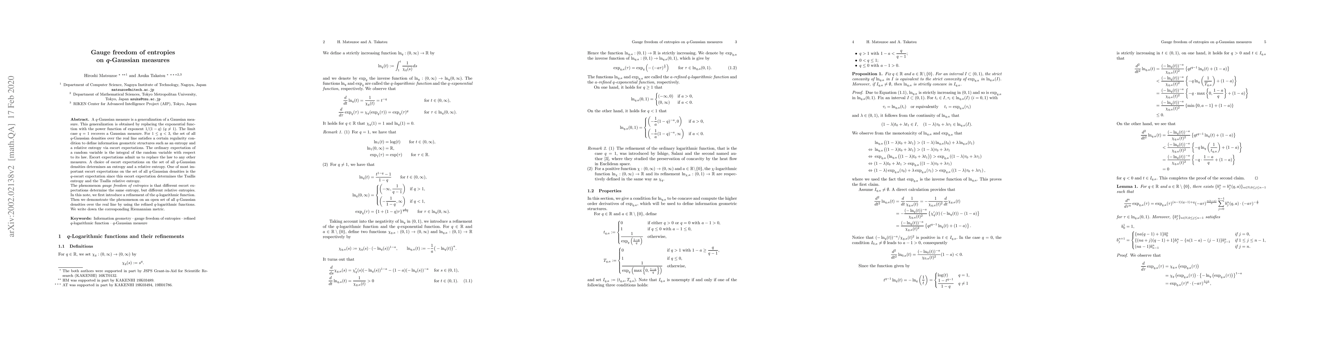 This paper explores the gauge freedom of entropies defined on $q$-Gaussian measures, demonstrating that different escort expectations can yield the same entropy but distinct relative entropies. It introduces a refined $q$-logarithmic function and uses it to illustrate this phenomenon on $q$-Gaussian densities over the real line, alongside the corresponding Riemannian metric.