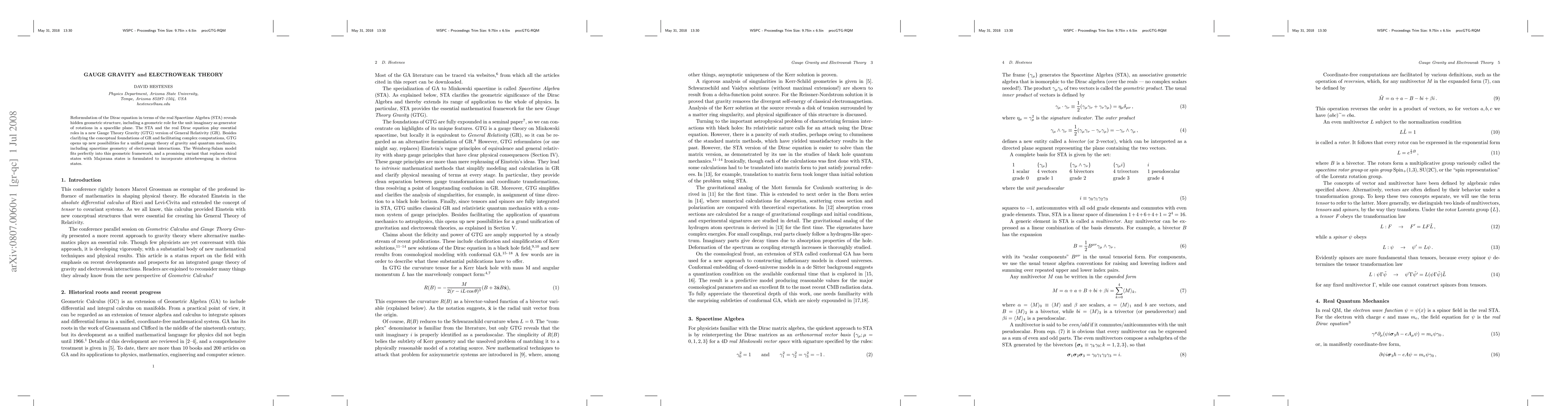 Reformulation of the Dirac equation in terms of the real Spacetime Algebra (STA) reveals hidden geometric structure, including a geometric role for the unit imaginary as generator of rotations in a spacelike plane. The STA and the real Dirac equation play essential roles in a new Gauge Theory Gravity (GTG) version of General Relativity (GR). Besides clarifying the conceptual foundations of GR and facilitating complex computations, GTG opens up new possibilities for a unified gauge theory of gravity and quantum mechanics, including spacetime geometry of electroweak interactions. The Weinberg-Salam model fits perfectly into this geometric framework, and a promising variant that replaces chiral states with Majorana states is formulated to incorporate zitterbewegung in electron states.
