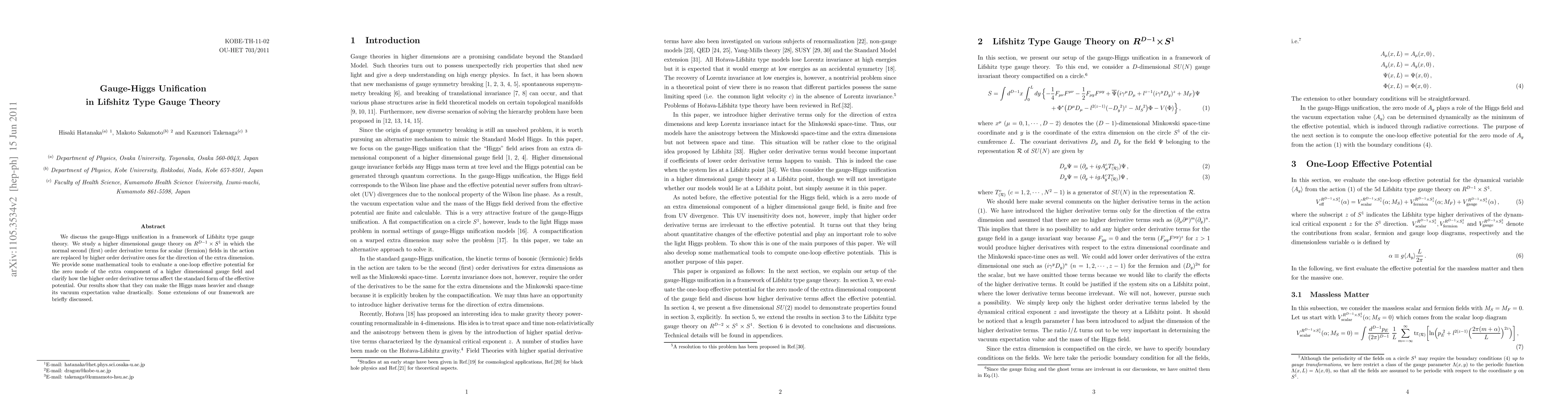 We discuss the gauge-Higgs unification in a framework of Lifshitz type gauge theory. We study a higher dimensional gauge theory on R^{D-1}\times S^{1} in which the normal second (first) order derivative terms for scalar (fermion) fields in the action are replaced by higher order derivative ones for the direction of the extra dimension. We provide some mathematical tools to evaluate a one-loop effective potential for the zero mode of the extra component of a higher dimensional gauge field and clarify how the higher order derivative terms affect the standard form of the effective potential. Our results show that they can make the Higgs mass heavier and change its vacuum expectation value drastically. Some extensions of our framework are briefly discussed.