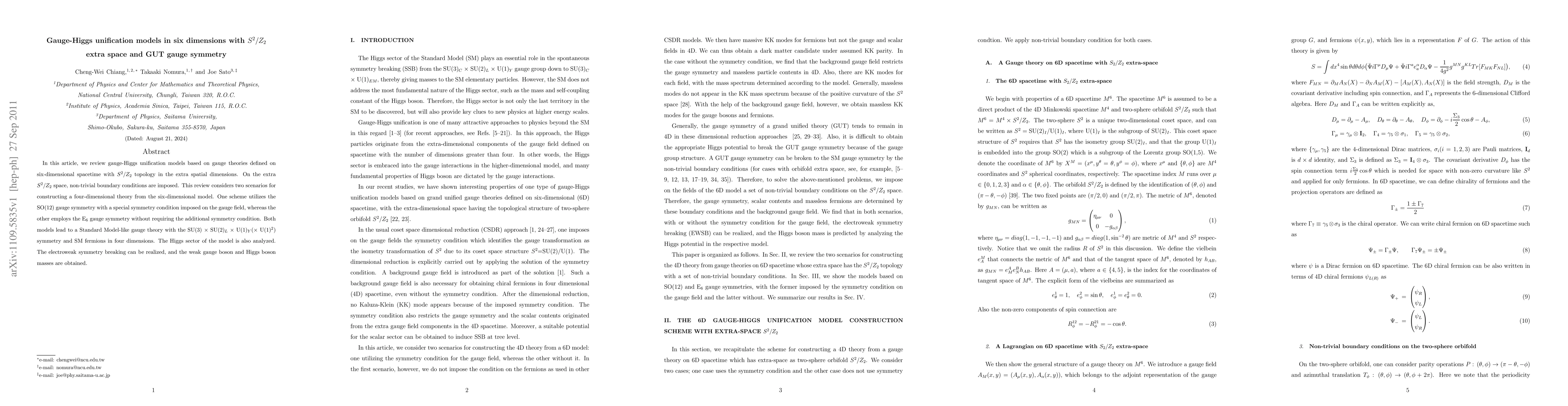 This paper reviews gauge-Higgs unification models in six-dimensional spacetime with $S^2/Z_2$ extra space, focusing on two scenarios: one using SO(12) and another using E$_6$ gauge symmetry. Both scenarios yield a Standard Model-like gauge theory and realize electroweak symmetry breaking.