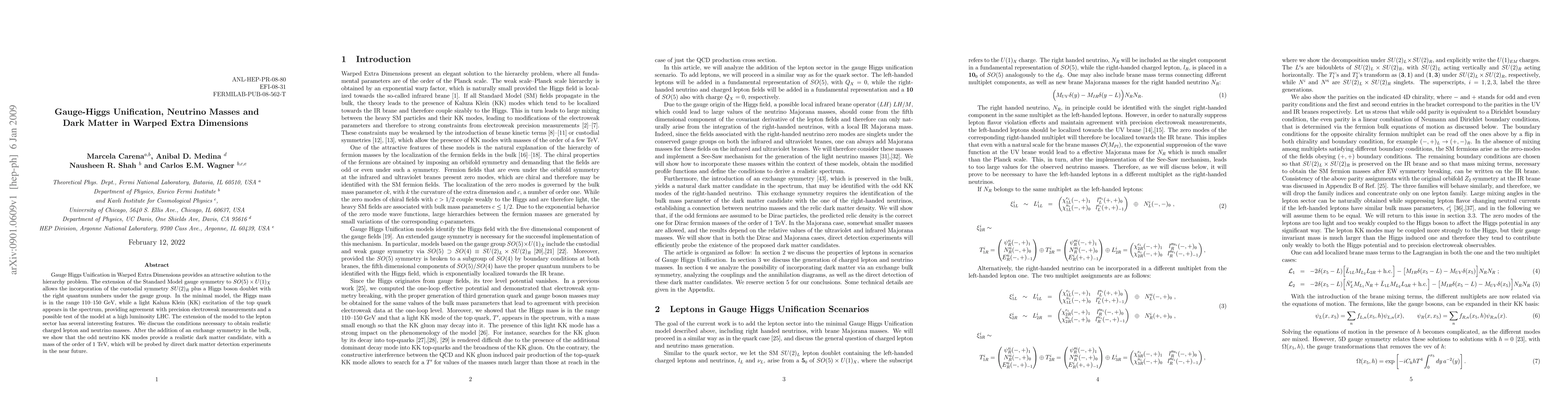 This paper explores Gauge-Higgs Unification in warped extra dimensions to address the hierarchy problem, proposing an $SO(5)xU(1)_X$ gauge symmetry that includes a custodial symmetry and a Higgs doublet. It predicts a light top quark Kaluza-Klein excitation and discusses conditions for realistic charged lepton and neutrino masses, suggesting odd neutrino Kaluza-Klein modes as viable dark matter candidates around 1 TeV.