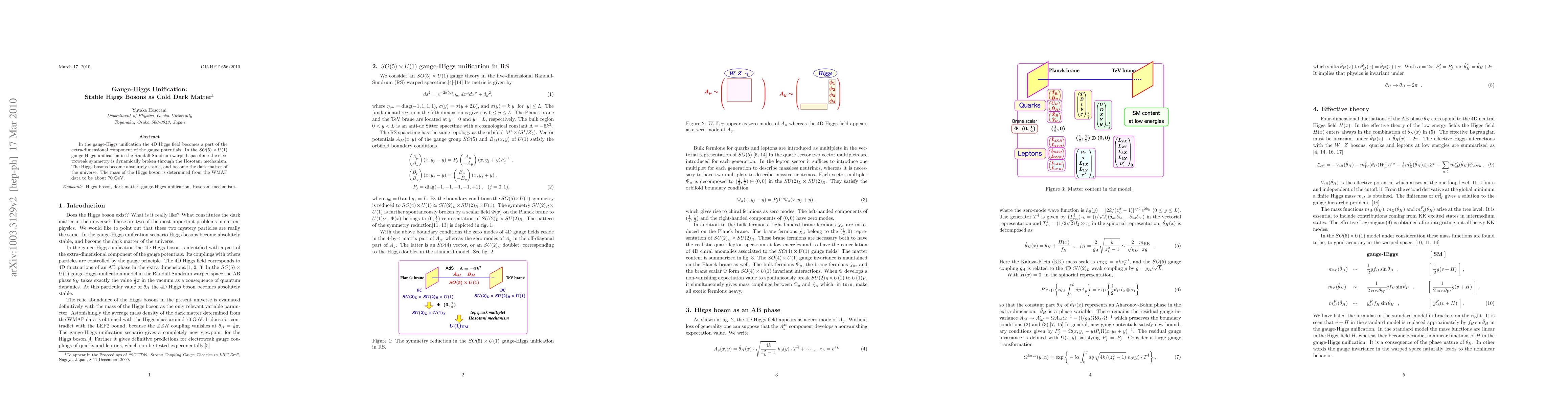 This paper explores gauge-Higgs unification in the context of $SO(5) \times U(1)$ symmetry breaking via the Hosotani mechanism, proposing that stable Higgs bosons in a Randall-Sundrum warped spacetime could serve as cold dark matter, with a mass around 70 GeV as inferred from WMAP data.