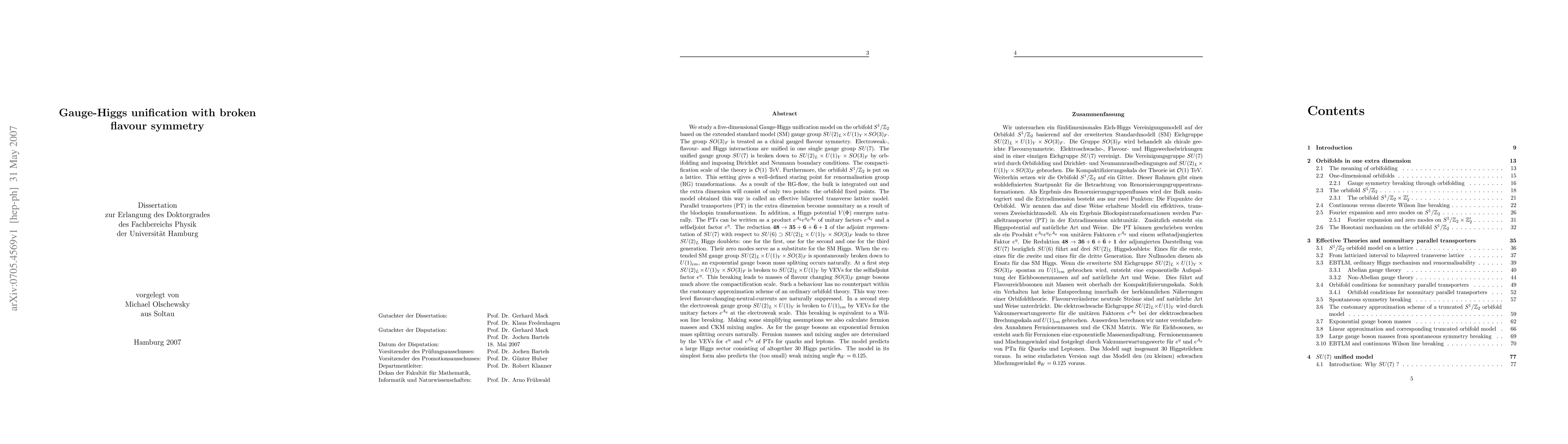 We study Gauge-Higgs unification model on the orbifold $S^{1}/Z_{2}$ based on the extended SM gauge group $G_{SM}^{ex}=SU(2)_{L} \times U(1)_{Y} \times SO(3)_{F}$. The group $SO(3)_{F}$ is treated as a chiral gauged flavour symmetry. Electroweak-, flavour- and Higgs interactions are unified in one single gauge group SU(7) which is broken again down to $G_{SM}^{ex}$ by orbifolding and imposing additional boundary conditions. The compactification scale is O(1) TeV. The orbifold $S^{1}/Z_{2}$ is put on a lattice. This setting gives a staring point for RG-transformations. As a result the bulk is integrated out and the extra dimension consist of only two points: the orbifold fixed points. Parallel transporters (PT) in the extra dimension become nonunitary as a result of the blockspin transformations. In addition, a Higgs potential emerges naturally. The PTs can be written as a product $e^{A_{y}} e^{\eta} e^{A_{y}}$ of unitary factors $e^{A_{y}}$ and a selfadjoint factor $e^{\eta}$. The reduction $48 \to 35 + 6 + \bar{6} + 1$ of the adjoint reps of SU(7) with respect to $SU(6) \supset G_{SM}^{ex}$ leads to three $SU(2)_{L}$ Higgs doublets: one for each flavour. Their zero modes serve as a substitute for the SM Higgs. When $G_{SM}^{ex}$ is spontaneously broken down to $U(1)_{em}$, an exponential gauge boson mass splitting occurs naturally. This breaking leads to $SO(3)_{F}$ flavour gauge boson masses much above the compactification scale. Thus tree-level FCNC are naturally suppressed. Making some simplifying assumptions we also calculate fermion masses and CKM mixing angles. As for the gauge bosons an exponential fermion mass splitting occurs naturally. The model predicts a large Higgs sector consisting of 30 Higgs particles and in its simplest form the weak mixing angle $\theta=0.125$.
