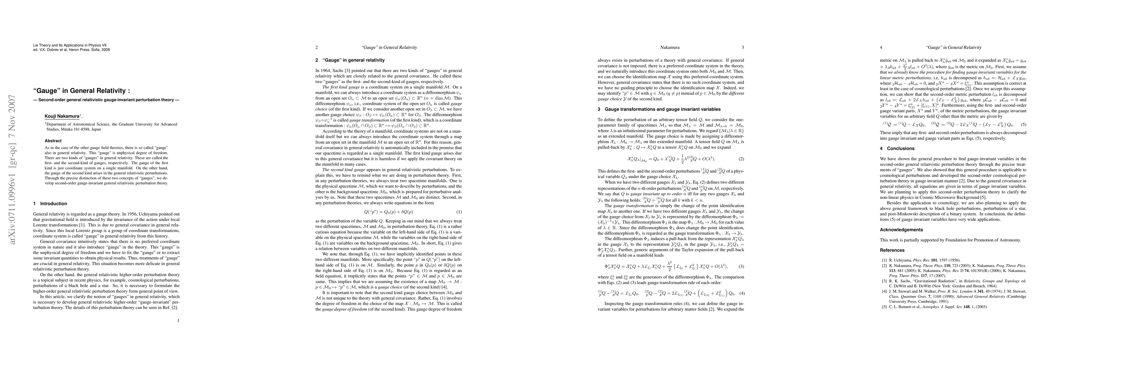 This paper develops a second-order perturbation theory for general relativity that distinguishes between two types of gauges: first-kind gauges related to coordinate systems, and second-kind gauges arising in relativistic perturbations, ensuring gauge invariance throughout the analysis.