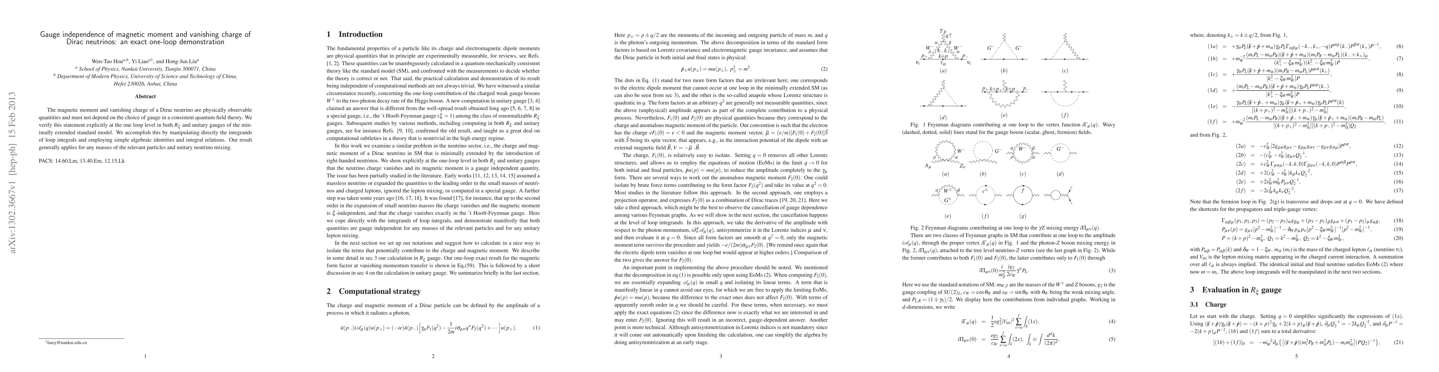 This research paper demonstrates, through exact one-loop calculations in both R_xi and unitary gauges, that the magnetic moment and vanishing charge of Dirac neutrinos are gauge-independent. The method involves direct manipulation of loop integrands and application of algebraic identities and integral relations, applicable to any neutrino masses and unitary mixing scenarios.