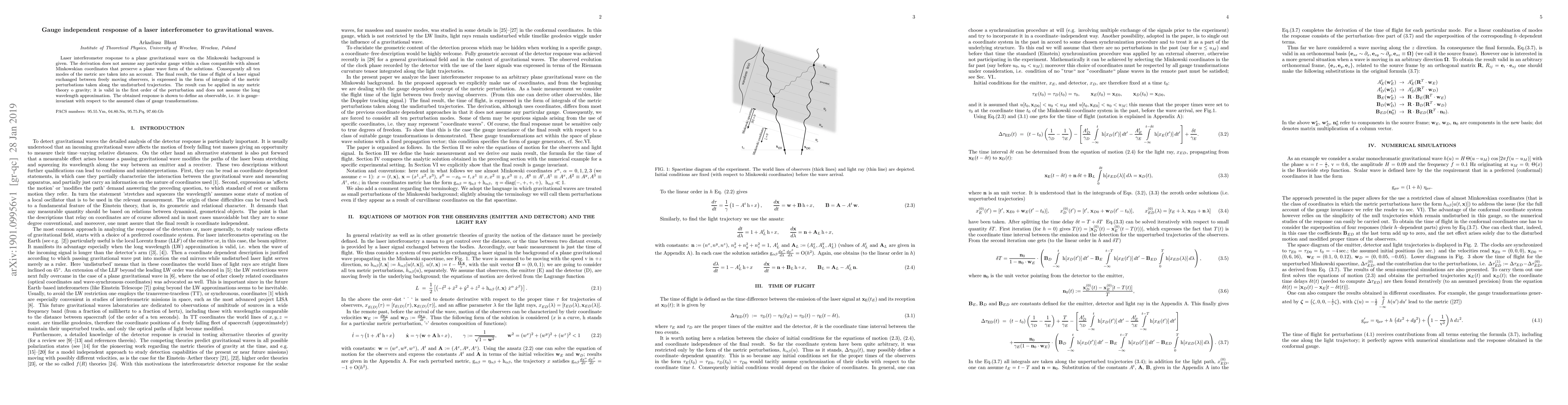 Laser interferometer response to a plane gravitational wave on the Minkowski background is given. The derivation does not assume any particular gauge within a class compatible with almost Minkowskian coordinates that preserve a plane wave form of the solutions. Consequently all ten modes of the metric are taken into an account. The final result, the time of flight of a laser signal exchanged between freely moving observers, is expressed in the form of integrals of the metric perturbations taken along the undisturbed trajectories. The result can be applied in any metric theory o gravity; it is valid in the first order of the perturbation and does not assume the long wavelength approximation. The obtained response is shown to define an observable, i.e. it is gauge--invariant with respect to the assumed class of gauge transformations