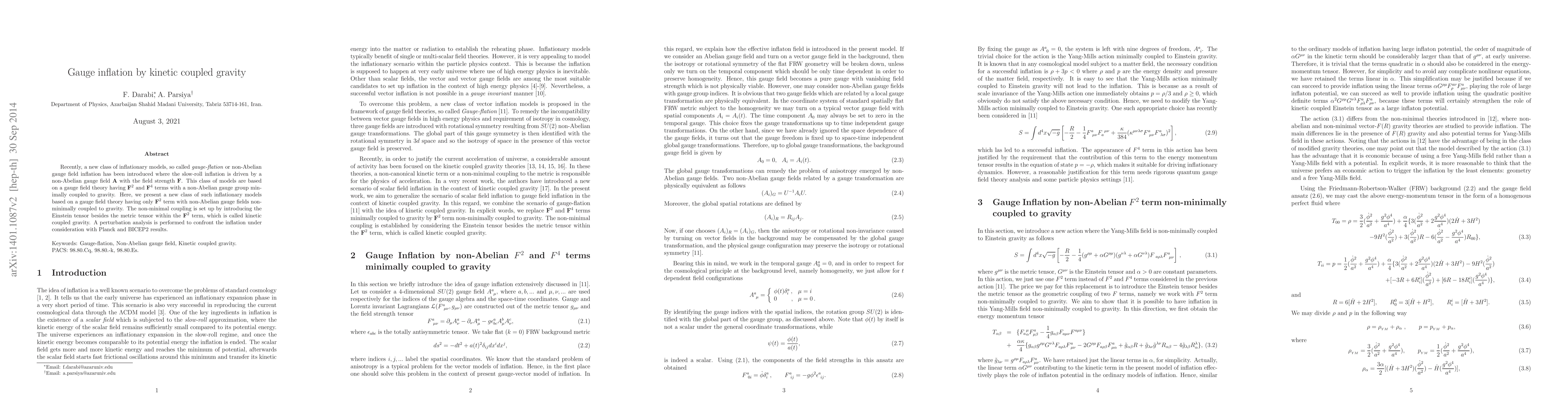 This paper introduces a new class of gauge-flation models where inflation is driven by non-Abelian gauge fields with kinetic terms non-minimally coupled to gravity through the Einstein tensor. A perturbation analysis compares the model's predictions to observational data from Planck and BICEP2.