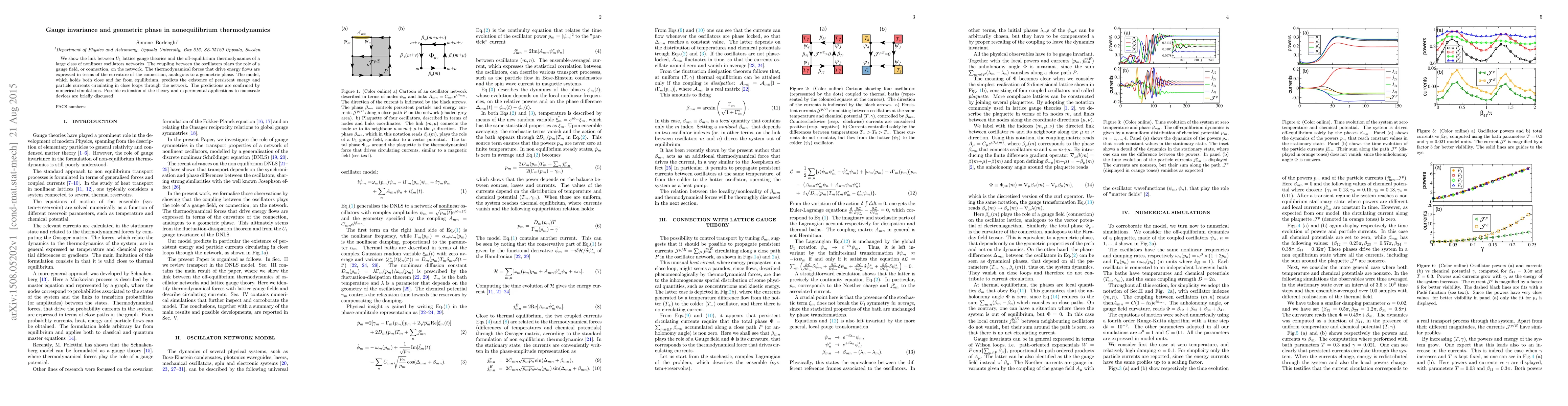 We show the link between U1 lattice gauge theories and the off-equilibrium thermodynamics of a large class of nonlinear oscillators networks. The coupling between the oscillators plays the role of a gauge field, or connection, on the network. The thermodynamical forces that drive energy flows are expressed in terms of the curvature of the connection, analogous to a geometric phase. The model, which holds both close and far from equilibrium, predicts the existence of persistent energy and particle currents circulating in close loops through the network. The predictions are confirmed by numerical simulations. Possible extension of the theory and experimental applications to nanoscale devices are briefly discussed.
