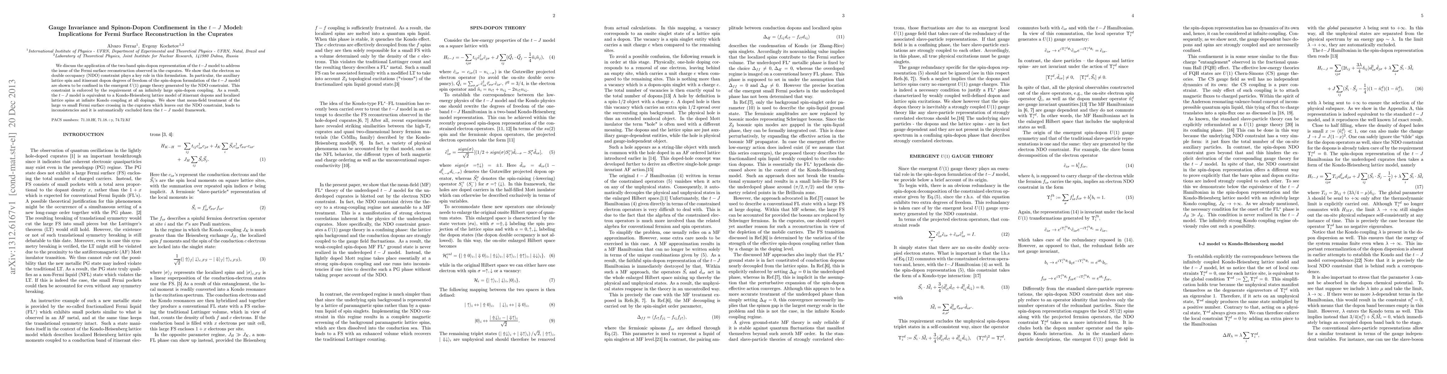 This paper explores the t-J model's spin-dopon representation to explain Fermi surface reconstruction in cuprates, emphasizing the electron no double occupancy (NDO) constraint. It reveals that spin and dopon confinement in the emergent U(1) gauge theory resolves inconsistencies in mean-field treatments, highlighting the NDO constraint's crucial role.