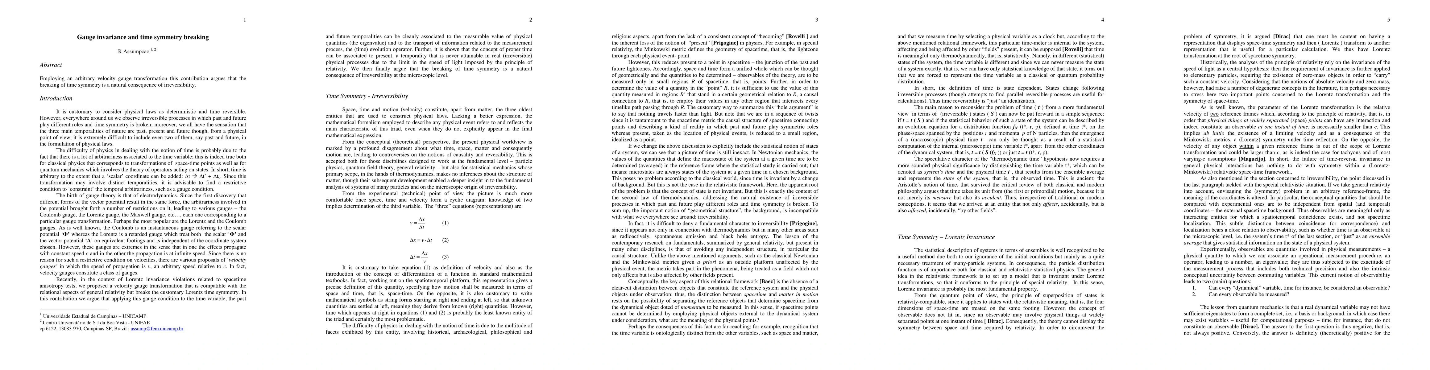 Summary: This paper demonstrates that time symmetry breaking is inherently linked to irreversibility through the application of an arbitrary velocity gauge transformation, suggesting a fundamental connection between gauge invariance and temporal asymmetry.