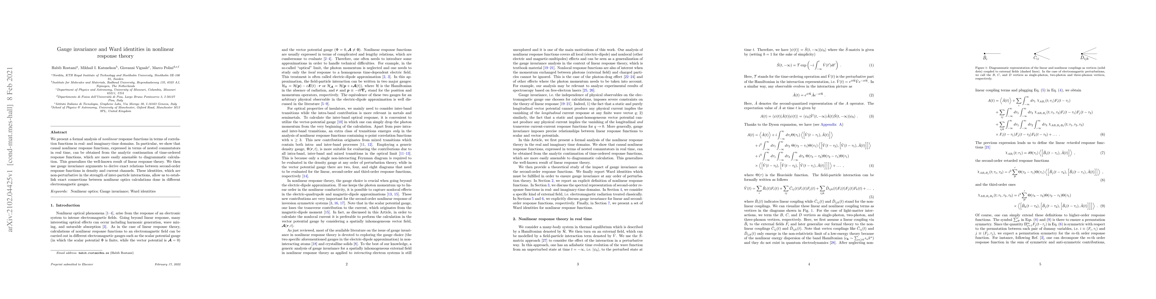 This paper analyzes nonlinear response functions through correlation functions, showing how causal nonlinear responses can be derived from time-ordered responses. It leverages gauge invariance to derive exact relations between second-order response functions, establishing non-perturbative connections between different gauges in nonlinear optics.