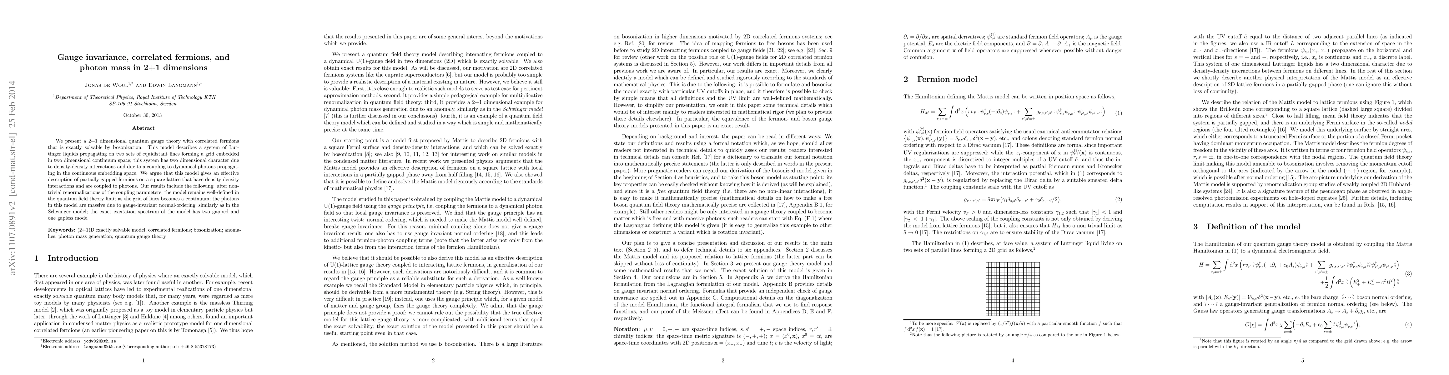 Researchers created a 2D quantum gauge theory with correlated fermions that describes partially gapped fermions on a square lattice with density-density interactions and photon coupling, exhibiting massive photons and an exact excitation spectrum.