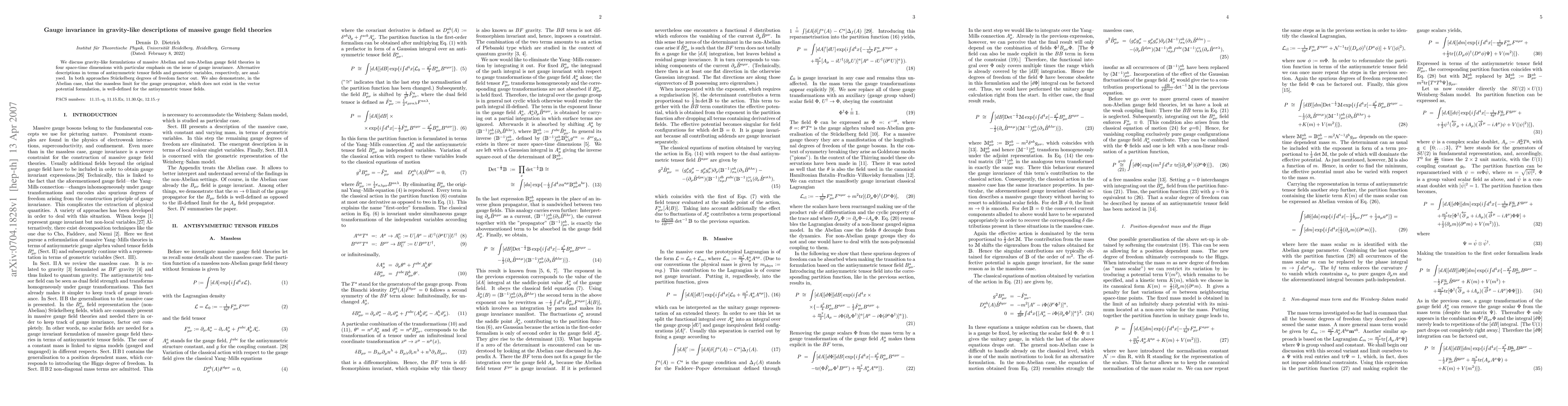 This paper explores gravity-like formulations of massive gauge field theories, focusing on gauge invariance issues. It analyzes alternative descriptions using antisymmetric tensor fields and geometric variables, showing that Stückelberg degrees of freedom are factored out, and that the massless limit is well-defined for the Abelian case.