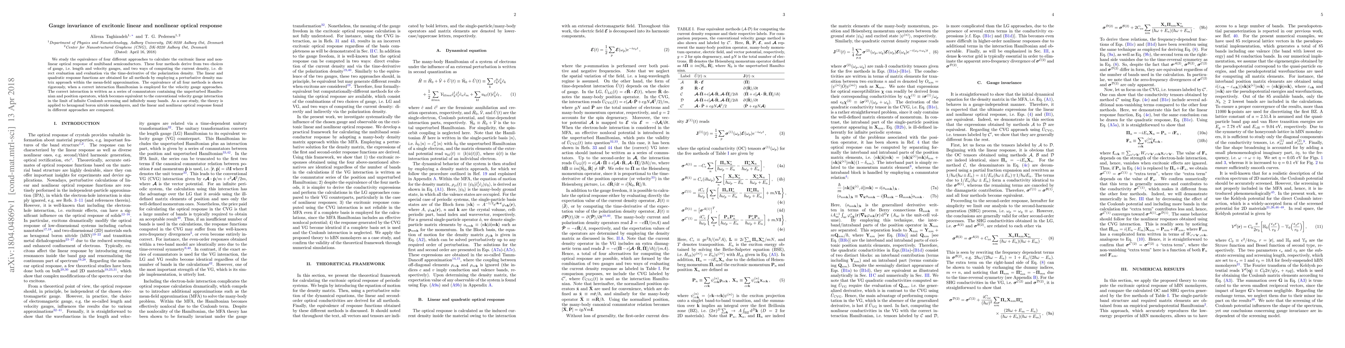 We study the equivalence of four different approaches to calculate the excitonic linear and nonlinear optical response of multiband semiconductors. These four methods derive from two choices of gauge, i.e. length and velocity gauges, and two ways of computing the current density, i.e. direct evaluation and evaluation via the time-derivative of the polarization density. The linear and quadratic response functions are obtained for all methods by employing a perturbative density matrix approach within the mean-field approximation. The equivalence of all four methods is shown rigorously, when a correct interaction Hamiltonian is employed for the velocity gauge approaches. The correct interaction is written as a series of commutators containing the unperturbed Hamiltonian and position operators, which becomes equivalent to the conventional velocity gauge interaction in the limit of infinite Coulomb screening and infinitely many bands. As a case study, the theory is applied to hexagonal boron nitride monolayers, and the linear and nonlinear optical response found in different approaches are compared.