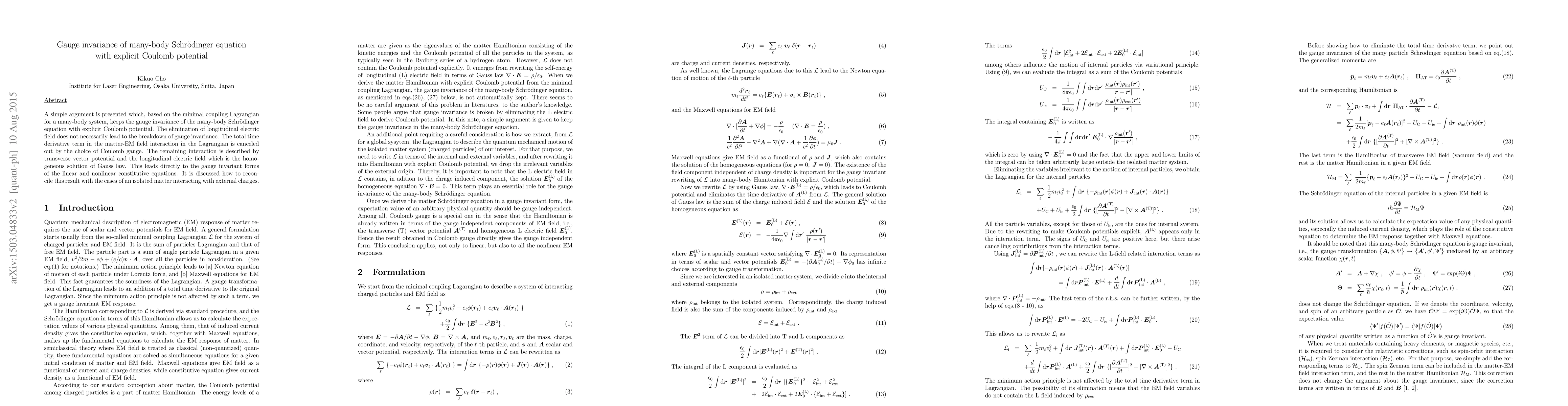 Summary: The paper demonstrates that the many-body Schrödinger equation with explicit Coulomb potential maintains gauge invariance through minimal coupling and the choice of Coulomb gauge, which cancels the total time derivative term. This results in gauge invariant linear and nonlinear constitutive equations, even when longitudinal electric fields are eliminated.