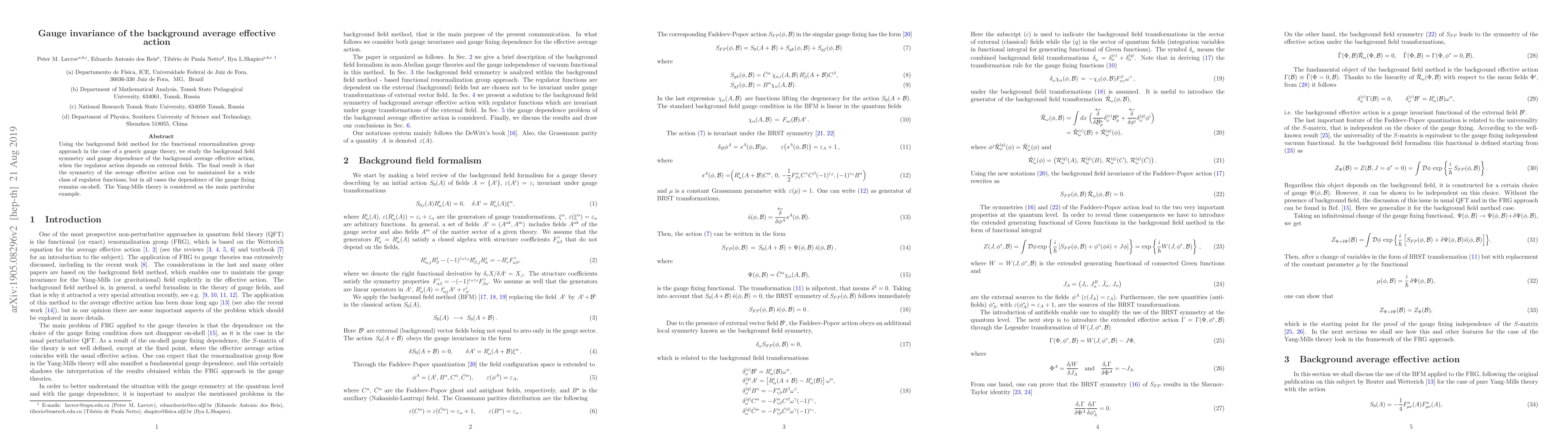 This paper explores the gauge invariance of the background average effective action in gauge theories using the background field method within the functional renormalization group approach. It concludes that while the symmetry can be preserved for various regulator functions, the gauge fixing dependence remains on-shell, exemplified by the Yang-Mills theory.