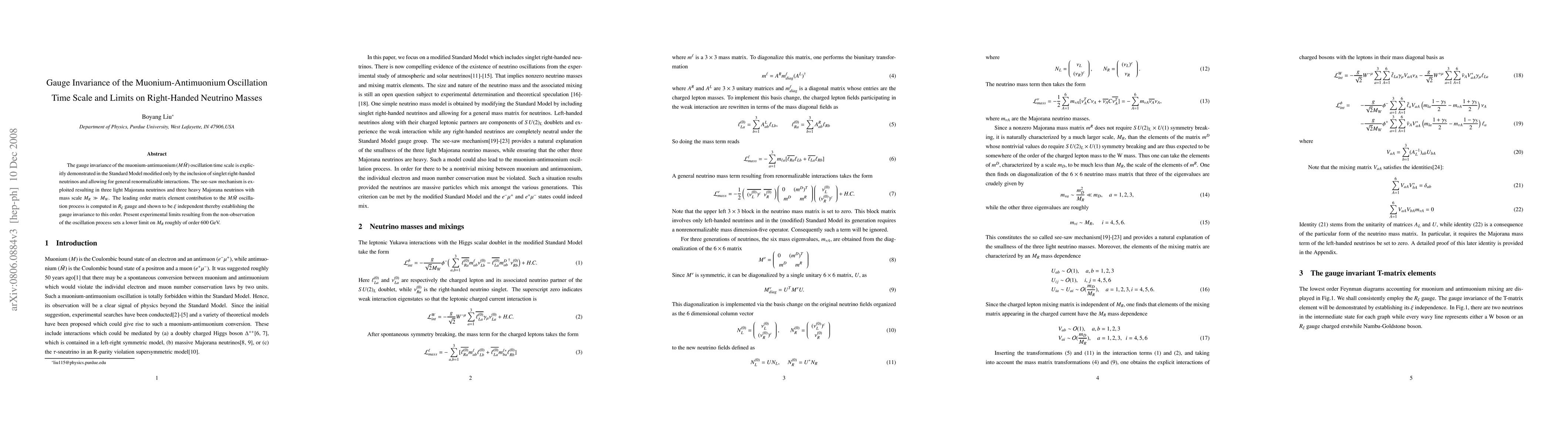 The gauge invariance of the muonium-antimuonium ($M\bar{M}$) oscillation time scale is explicitly demonstrated in the Standard Model modified only by the inclusion of singlet right-handed neutrinos and allowing for general renormalizable interactions. The see-saw mechanism is exploited resulting in three light Majorana neutrinos and three heavy Majorana neutrinos with mass scale $M_R\gg M_W$. The leading order matrix element contribution to the $M\bar{M}$ oscillation process is computed in $R_\xi$ gauge and shown to be $\xi$ independent thereby establishing the gauge invariance to this order. Present experimental limits resulting from the non-observation of the oscillation process sets a lower limit on $M_R$ roughly of order 600 GeV.