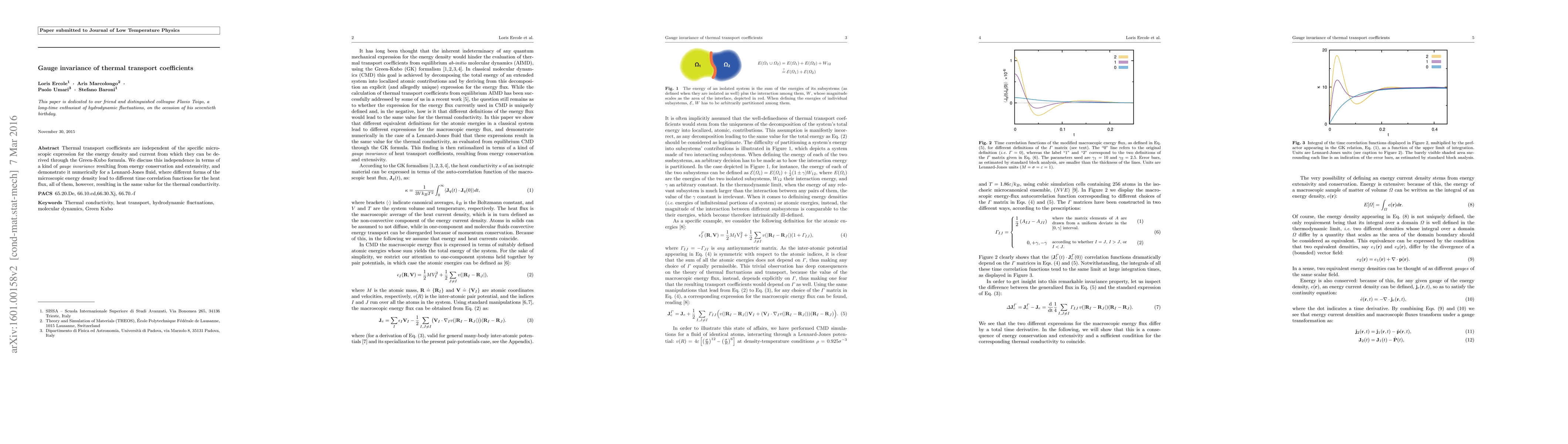 This paper explores the gauge invariance of thermal transport coefficients, demonstrating that they remain consistent despite different microscopic expressions for energy density and current, due to energy conservation and extensivity. Numerical results for a Lennard-Jones fluid confirm this invariance, showing identical thermal conductivity regardless of the chosen microscopic model.