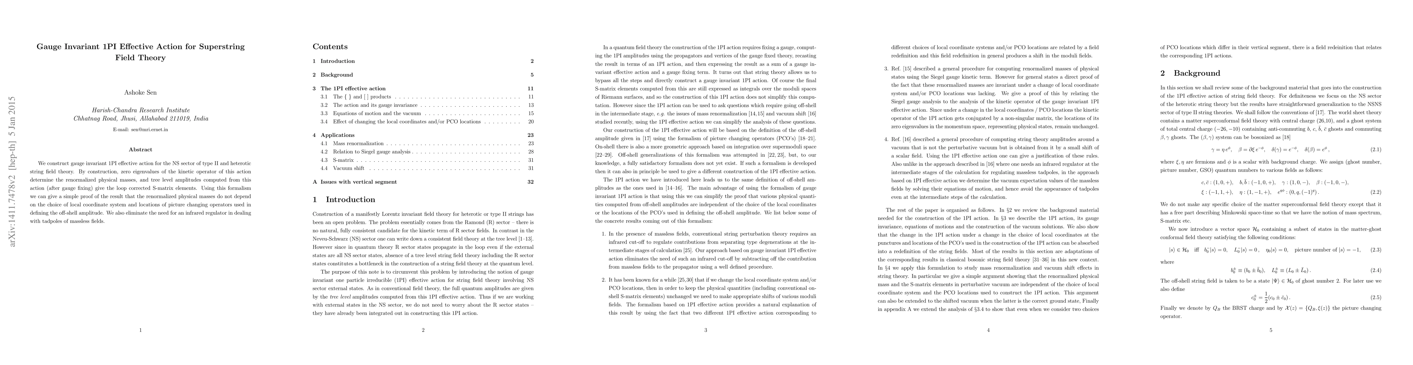 Researchers developed a gauge-invariant 1PI effective action for superstring field theory, which calculates physical masses and loop-corrected S-matrix elements, eliminating the need for infrared regulators.