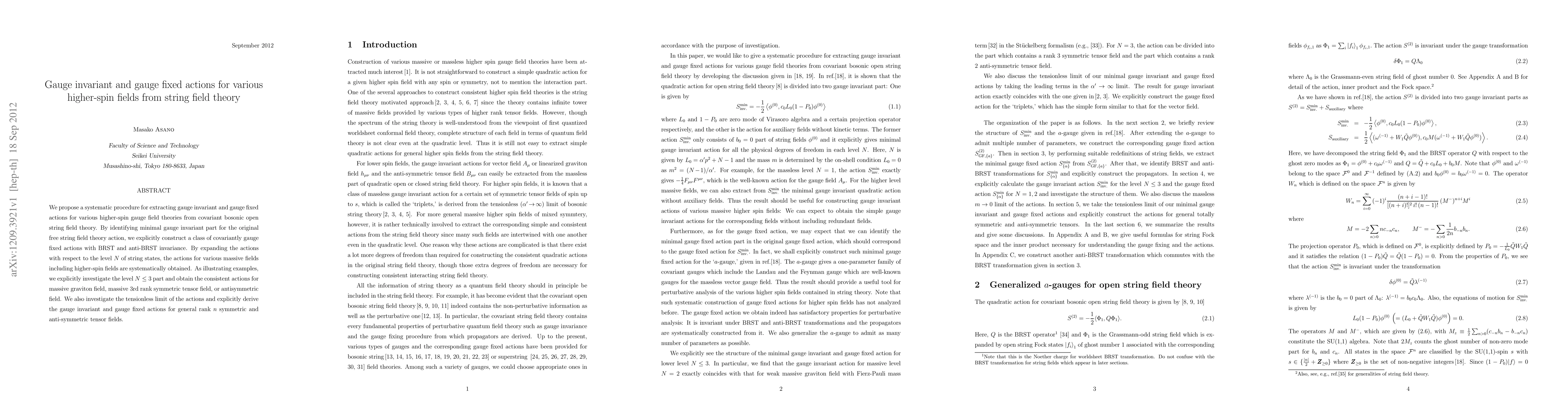 This paper proposes a method to derive gauge invariant and gauge fixed actions for higher-spin fields from bosonic open string field theory, ensuring BRST and anti-BRST invariance. It systematically constructs these actions by expanding with respect to the level N of string states, illustrating with examples up to N=3, and investigates tensionless limits for general rank tensor fields.