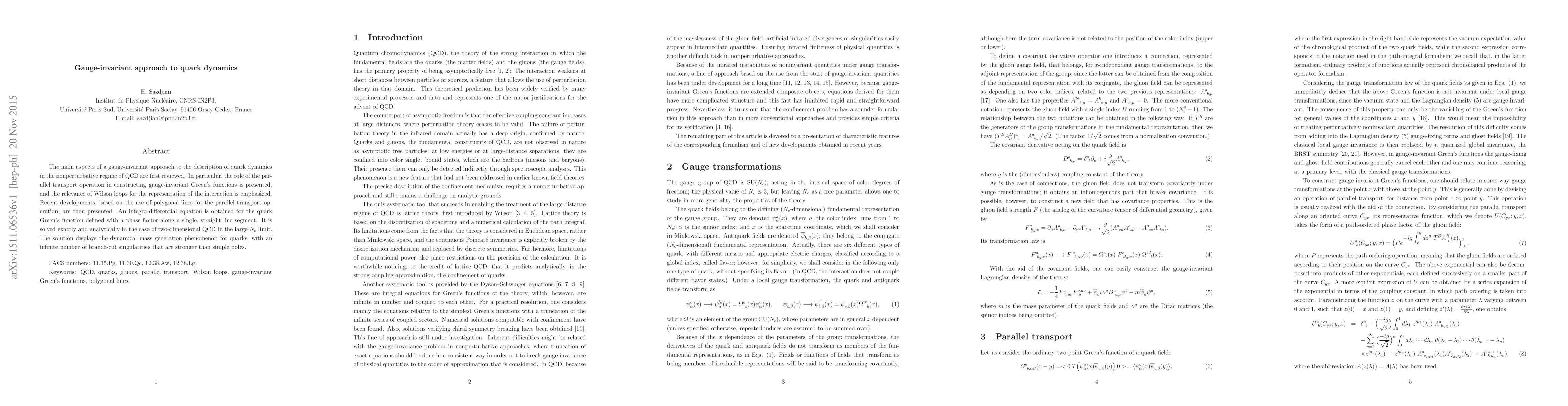 The main aspects of a gauge-invariant approach to the description of quark dynamics in the nonperturbative regime of QCD are first reviewed. In particular, the role of the parallel transport operation in constructing gauge-invariant Green's functions is presented, and the relevance of Wilson loops for the representation of the interaction is emphasized. Recent developments, based on the use of polygonal lines for the parallel transport operation, are then presented. An integro-differential equation is obtained for the quark Green's function defined with a phase factor along a single, straight line segment. It is solved exactly and analytically in the case of two-dimensional QCD in the large $N_c$ limit. The solution displays the dynamical mass generation phenomenon for quarks, with an infinite number of branch-cut singularities that are stronger than simple poles.