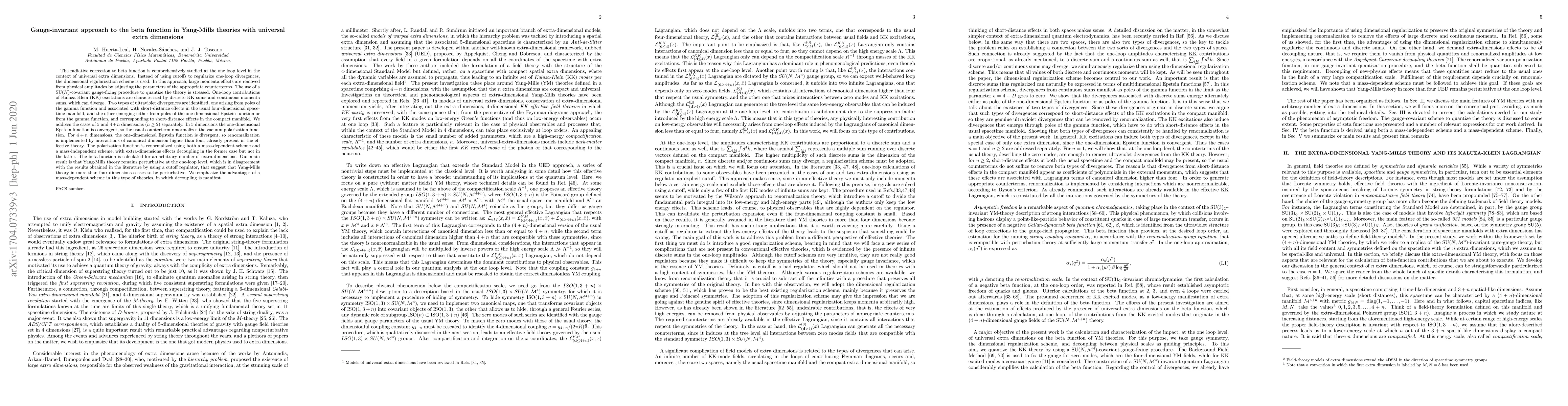 The radiative correction to beta function is comprehensively studied at 1 loop in the context of universal extra dimensions. Instead of using cutoffs to regularize 1-loop divergences, the dimensional regularization scheme is used. Large momenta effects are removed from physical amplitudes by adjusting the parameters of the appropriate counterterms. The use of a SU(N)-covariant gauge-fixing procedure is stressed. 1-loop contributions of KK excitations are characterized by discrete KK sums and continuous momenta sums, which can diverge. Two types of UVs are identified, one arising from poles of the gamma function and associated with short-distance effects in the usual 4-dimensional spacetime manifold, and the other emerging either from poles of the 1-dimensional Epstein function or from the gamma function, and corresponding to short-distance effects in the compact manifold. We address the cases of 5 and 4+n dimensions (n>1) separately. In 5 dimensions the 1-dimensional Epstein function is convergent, so the usual counterterm renormalizes the vacuum polarization function. For 4+n dimensions, the 1-dimensional Epstein function is divergent, so renormalization is implemented by interactions of canonical dimension higher than 4, already present in the effective theory. The polarization function is renormalized using both mass-dependent and mass-independent schemes, with extra-dimensions effects decoupling in the former case but not in the latter. The beta function is calculated for an arbitrary number of extra dimensions. Our main result is that Yang-Mills theory remains perturbative at 1 loop, which is in disagreement with the results obtained in the literature by using a cutoff regulator, which suggest that Yang-Mills theory in more than 4 dimensions ceases to be perturbative. We emphasize the advantages of a mass-dependent scheme in this type of theories, in which decoupling is manifest.