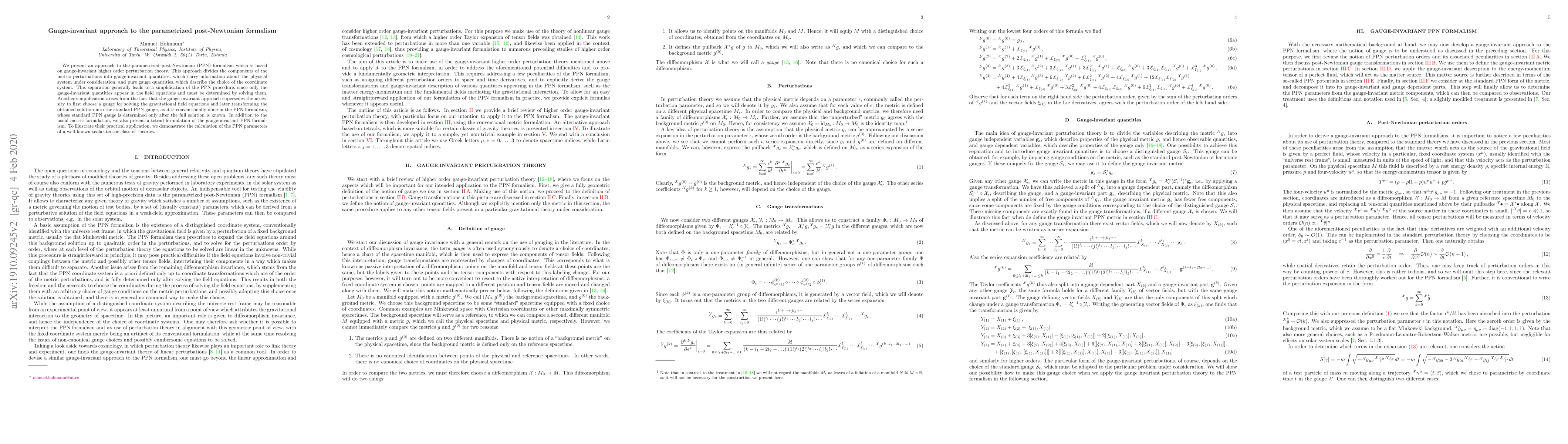 This paper introduces a gauge-invariant approach to the parametrized post-Newtonian (PPN) formalism, simplifying the procedure by separating metric perturbations into physical and coordinate-dependent components. It also presents a tetrad formulation and demonstrates the calculation of PPN parameters for scalar-tensor theories.