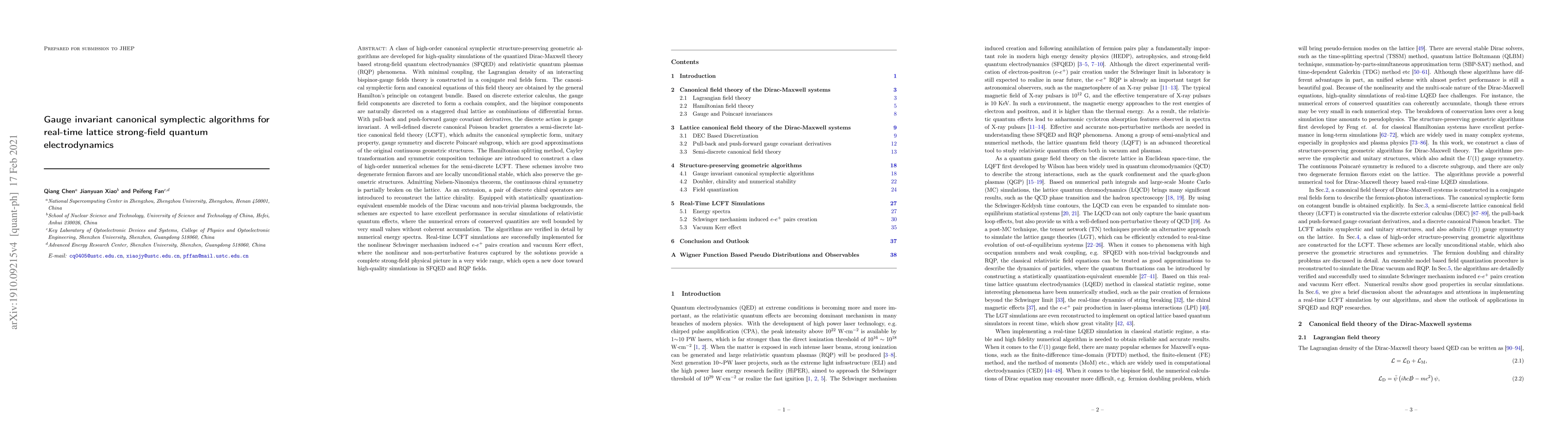 A class of high-order canonical symplectic structure-preserving geometric algorithms are developed for high-quality simulations of the quantized Dirac-Maxwell theory based strong-field quantum electrodynamics (SFQED) and relativistic quantum plasmas (RQP) phenomena. The Lagrangian density of an interacting bispinor-gauge fields theory is constructed in a conjugate real fields form. The canonical symplectic form and canonical equations of this field theory are obtained by the general Hamilton's principle on cotangent bundle. Based on discrete exterior calculus, the gauge field components are discreted to form a cochain complex, and the bispinor components are naturally discreted on a staggered dual lattice as combinations of differential forms. With pull-back and push-forward gauge covariant derivatives, the discrete action is gauge invariant. A well-defined discrete canonical Poisson bracket generates a semi-discrete lattice canonical field theory (LCFT), which admits the canonical symplectic form, unitary property, gauge symmetry and discrete Poincar\'e subgroup. The Hamiltonian splitting method, Cayley transformation and symmetric composition technique are introduced to construct a class of high-order numerical schemes. These schemes involve two degenerate fermion flavors and are locally unconditional stable, which also preserve the geometric structures. Equipped with statistically quantization-equivalent ensemble models of the Dirac vacuum and non-trivial plasma backgrounds, the schemes are expected to have excellent performance in secular simulations of relativistic quantum effects. The algorithms are verified in detail by numerical energy spectra. Real-time LCFT simulations are successfully implemented for the nonlinear Schwinger mechanism induced $e$-$e^+$ pairs creation and vacuum Kerr effect, which open a new door toward high-quality simulations in SFQED and RQP.