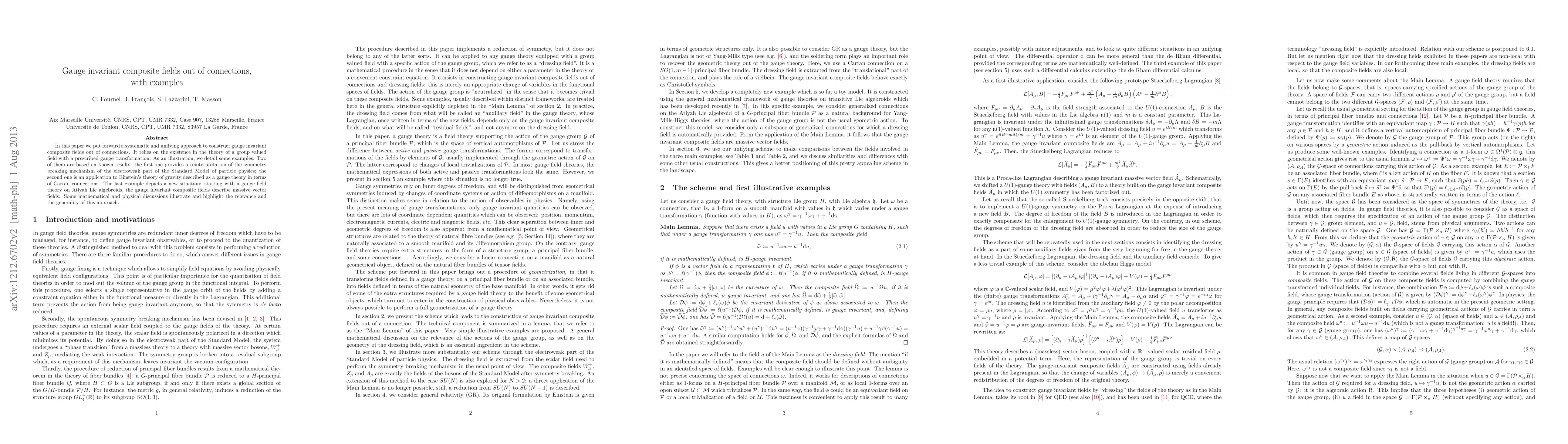 Researchers develop a method to create gauge-invariant composite fields from connections, with examples that reinterpret symmetry breaking in particle physics and apply to Einstein's gravity theory, showcasing the approach's generality and relevance.