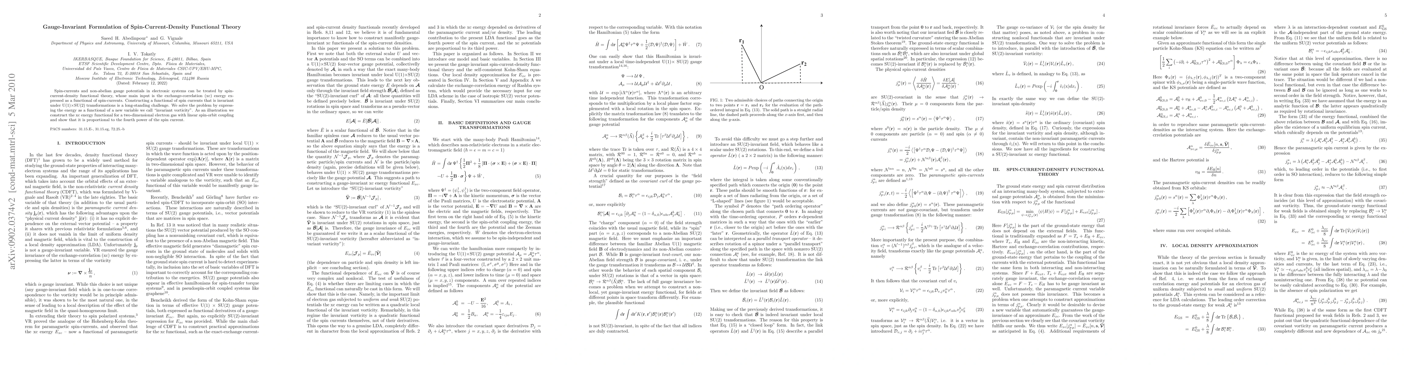 This paper presents a gauge-invariant formulation of spin-current-density functional theory, addressing the challenge of constructing a functional invariant under U(1)×SU(2) transformations. The authors introduce "invariant vorticity" to achieve this, demonstrating its application in constructing the exchange-correlation energy functional for a two-dimensional electron gas with linear spin-orbit coupling.