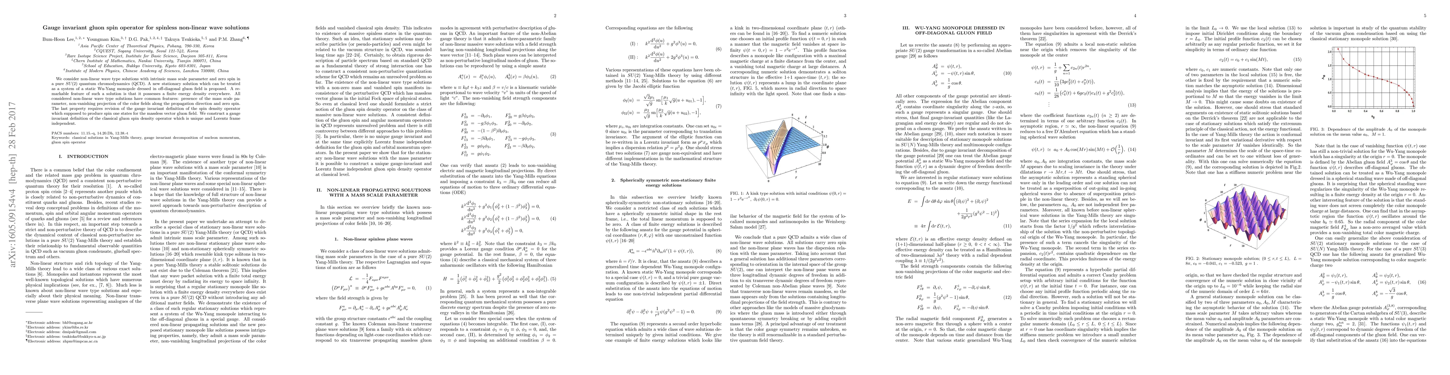 We consider non-linear wave type solutions with mass scale parameter and vahished canonical spin density operator in a pure SU(2) quantum chtomodynamics (QCD). A new stationary solution which can be treated as a system of static Wu-Yang monopole dressed in off-diagonal gluon field is proposed. A remarkable feature of such a solution is that it possesses a finite energy density everywhere. All considered non-linear wave type solutions have common features: presence of a mass scale parameter, non-vanishing projection of the color magnetic field along the propagation direction and zero spin density. The last property requires revision of the gauge invariant definition of the spin density operator which supposed to be massless vector field in the classical theory. We construct a gauge invariant definition of the classical gluon spin density which is unique and Lorentz frame independent.