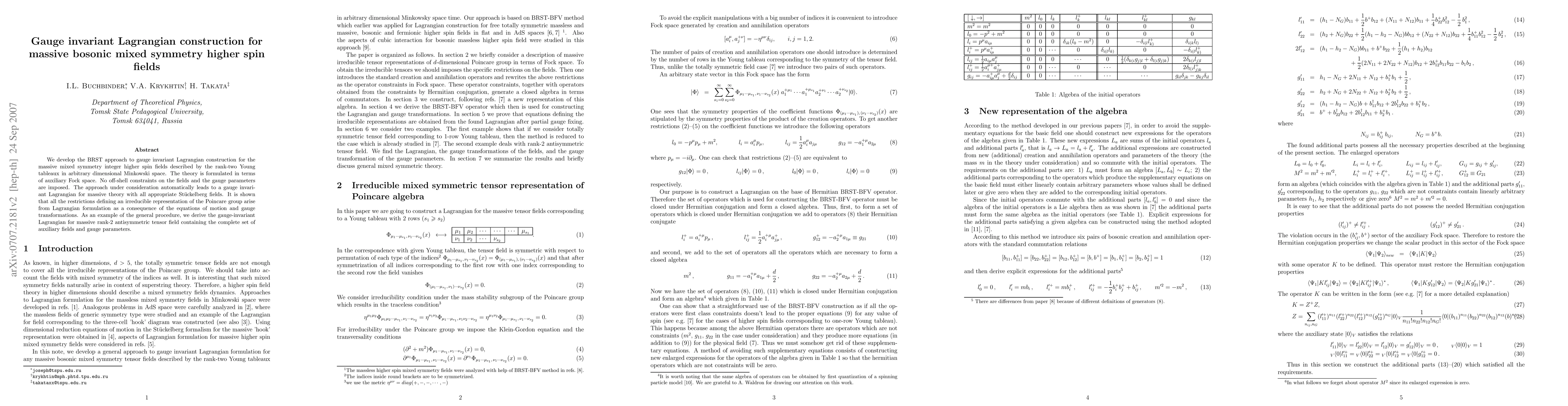 We develop the BRST approach to gauge invariant Lagrangian construction for the massive mixed symmetry integer higher spin fields described by the rank-two Young tableaux in arbitrary dimensional Minkowski space. The theory is formulated in terms of auxiliary Fock space. No off-shell constraints on the fields and the gauge parameters are imposed. The approach under consideration automatically leads to a gauge invariant Lagrangian for massive theory with all appropriate Stuckelberg fields. It is shown that all the restrictions defining an irreducible representation of the Poincare group arise from Lagrangian formulation as a consequence of the equations of motion and gauge transformations. As an example of the general procedure, we derive the gauge-invariant Lagrangian for massive rank-2 antisymmetric tensor field containing the complete set of auxiliary fields and gauge parameters.