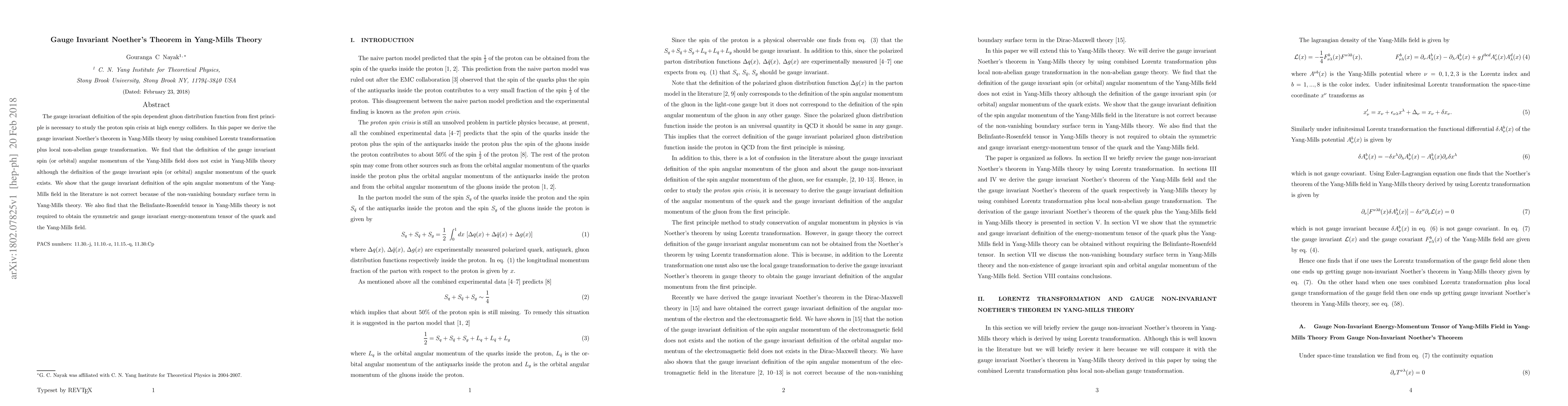 The gauge invariant definition of the spin dependent gluon distribution function from first principle is necessary to study the proton spin crisis at high energy colliders. In this paper we derive the gauge invariant Noether's theorem in Yang-Mills theory by using combined Lorentz transformation plus local non-abelian gauge transformation. We find that the definition of the gauge invariant spin (or orbital) angular momentum of the Yang-Mills field does not exist in Yang-Mills theory although the definition of the gauge invariant spin (or orbital) angular momentum of the quark exists. We show that the gauge invariant definition of the spin angular momentum of the Yang-Mills field in the literature is not correct because of the non-vanishing boundary surface term in Yang-Mills theory. We also find that the Belinfante-Rosenfeld tensor in Yang-Mills theory is not required to obtain the symmetric and gauge invariant energy-momentum tensor of the quark and the Yang-Mills field.